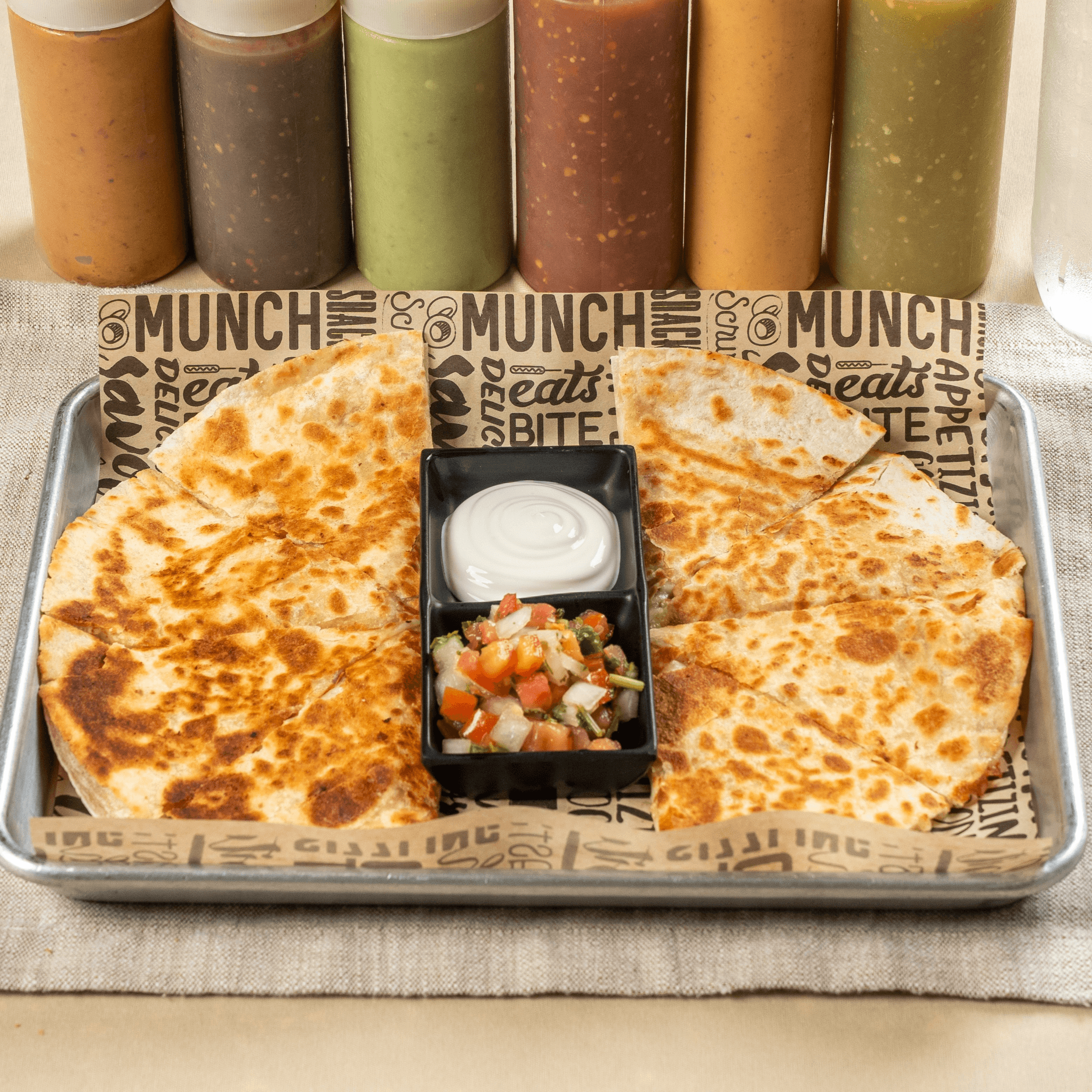 Get 3 rolled out flour tortillas, stuffed with cheese and shredded chicken, topped with avocado salsa and sour cream. Comes with 2 sides.