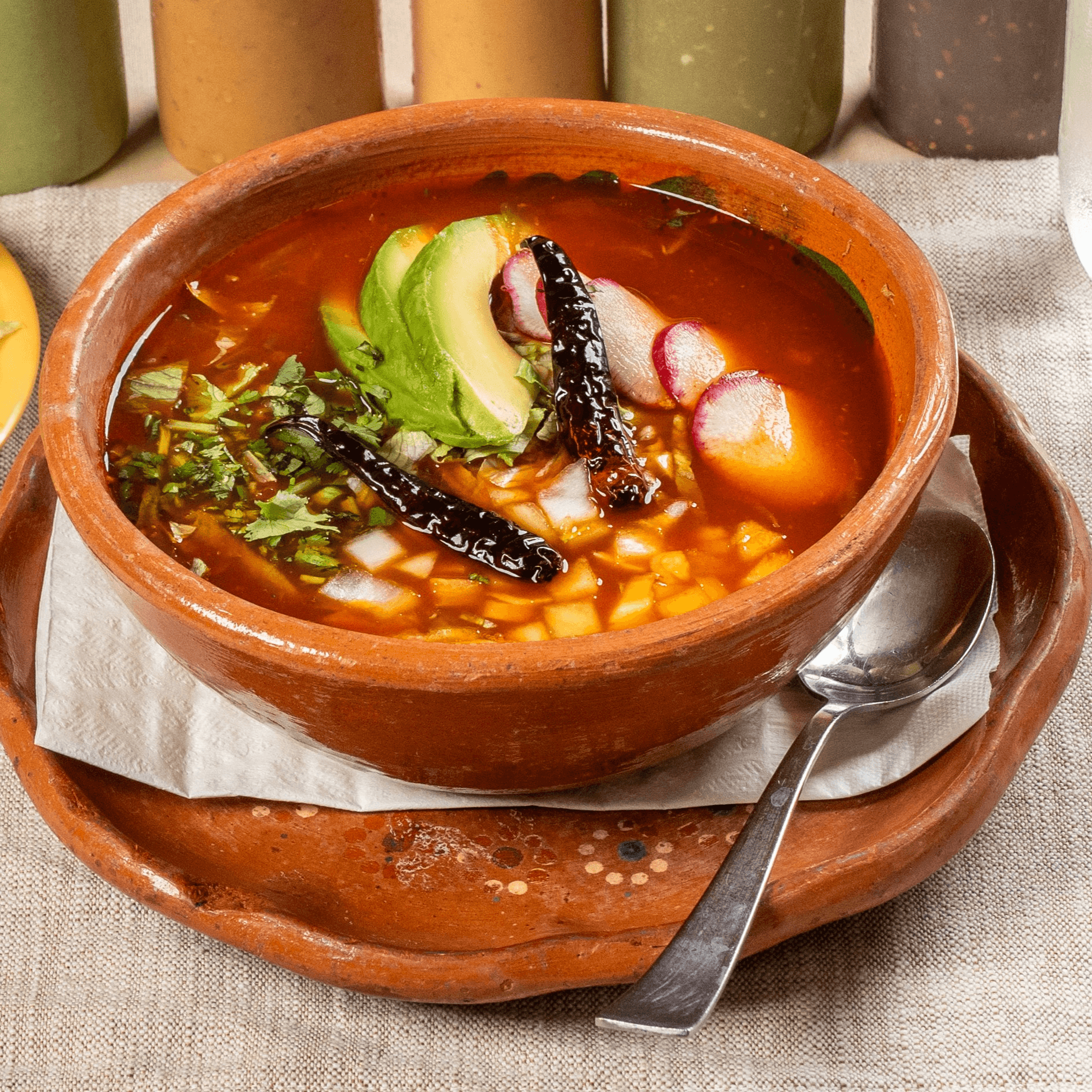 Pork and hominy red chilis soup, served with lettuce, radish, avocado, cilantro, onion and lime.