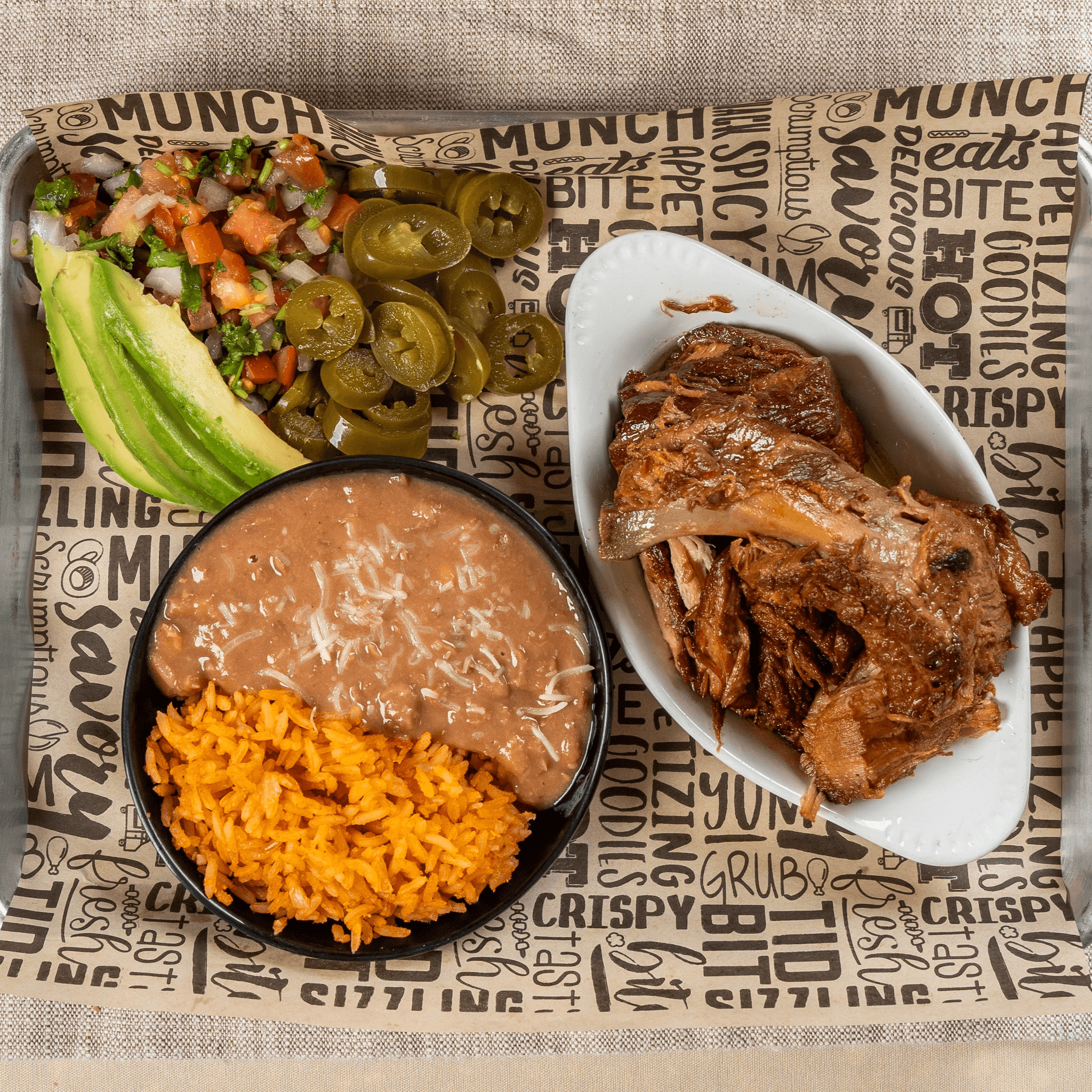 Homemade carnitas (pork) served with fresh pico de gallo, avocado, and jalapeño. Comes with two sides and your choice of tortillas.