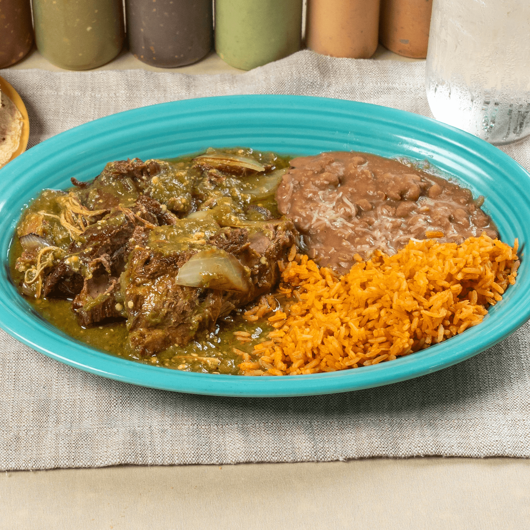 Tender chunks of pork simmered in a homemade green salsa. Served with two sides and warm tortillas.