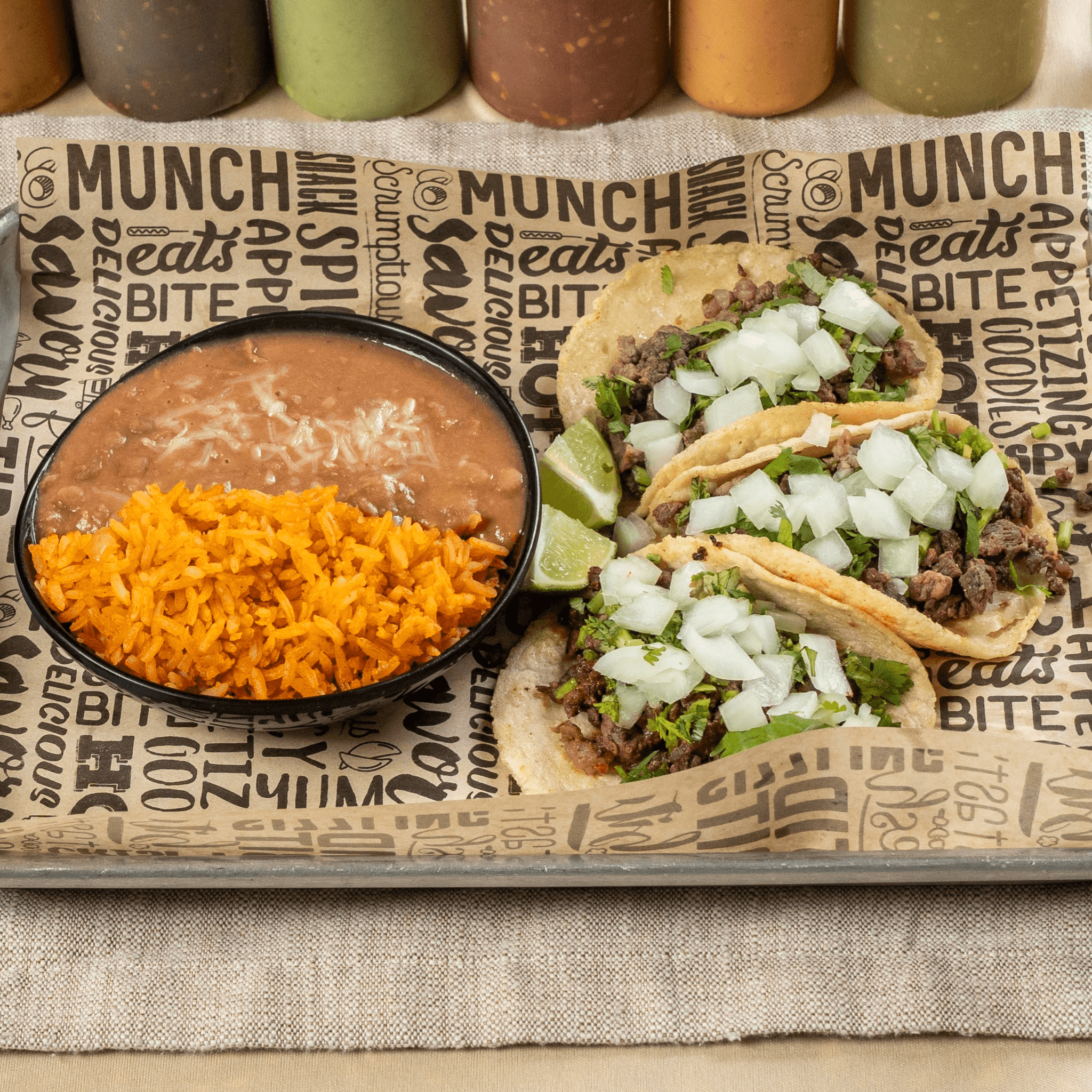 Choose your favorite meat! Topped with onion, cilantro and lime wedges.