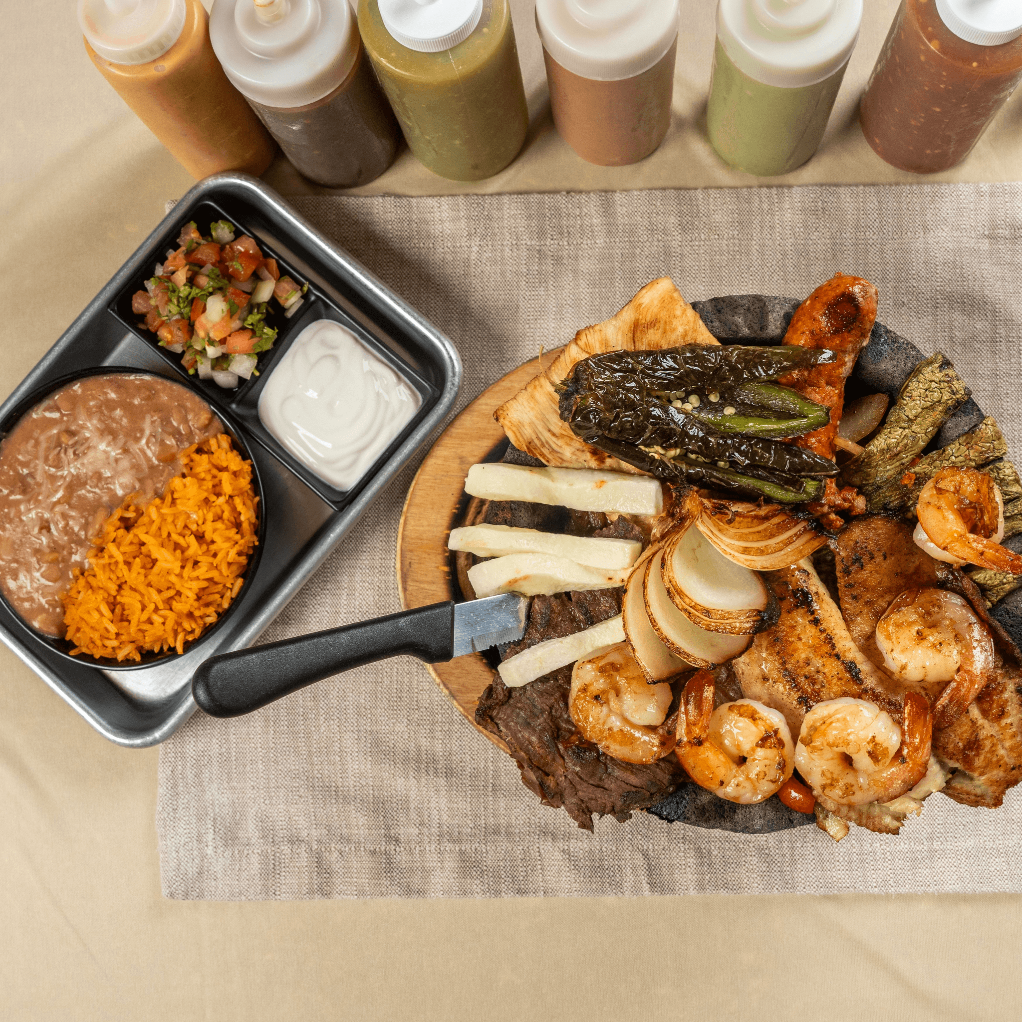 Comes with steak, chicken, chorizo, shrimp, and fish filet. Served with a flavorful mix of fresh onions, bell peppers, an nopal, fresh cheese salsa roja and tomatoes. Comes with pico de gallo and sour cream on the side. Comes with 2 sides as listed below and choice of tortilla.