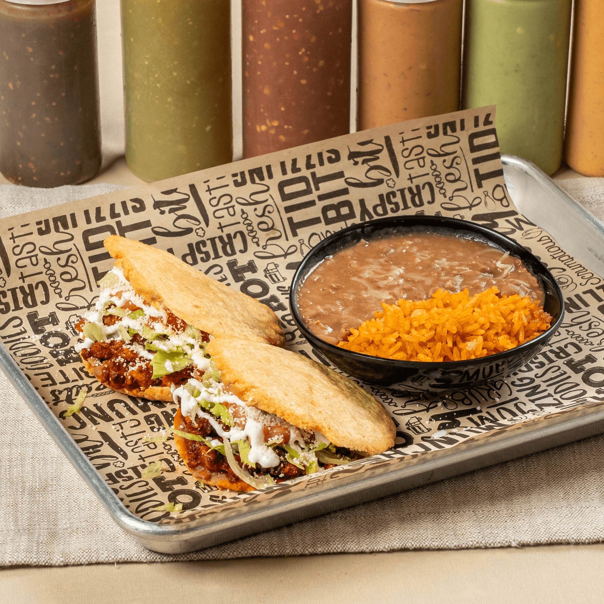 Gorditas with choice of shredded chicken or ground beef. Comes with beans, lettuce, sour cream, tomatoes and cotija cheese. Served with 2 sides.