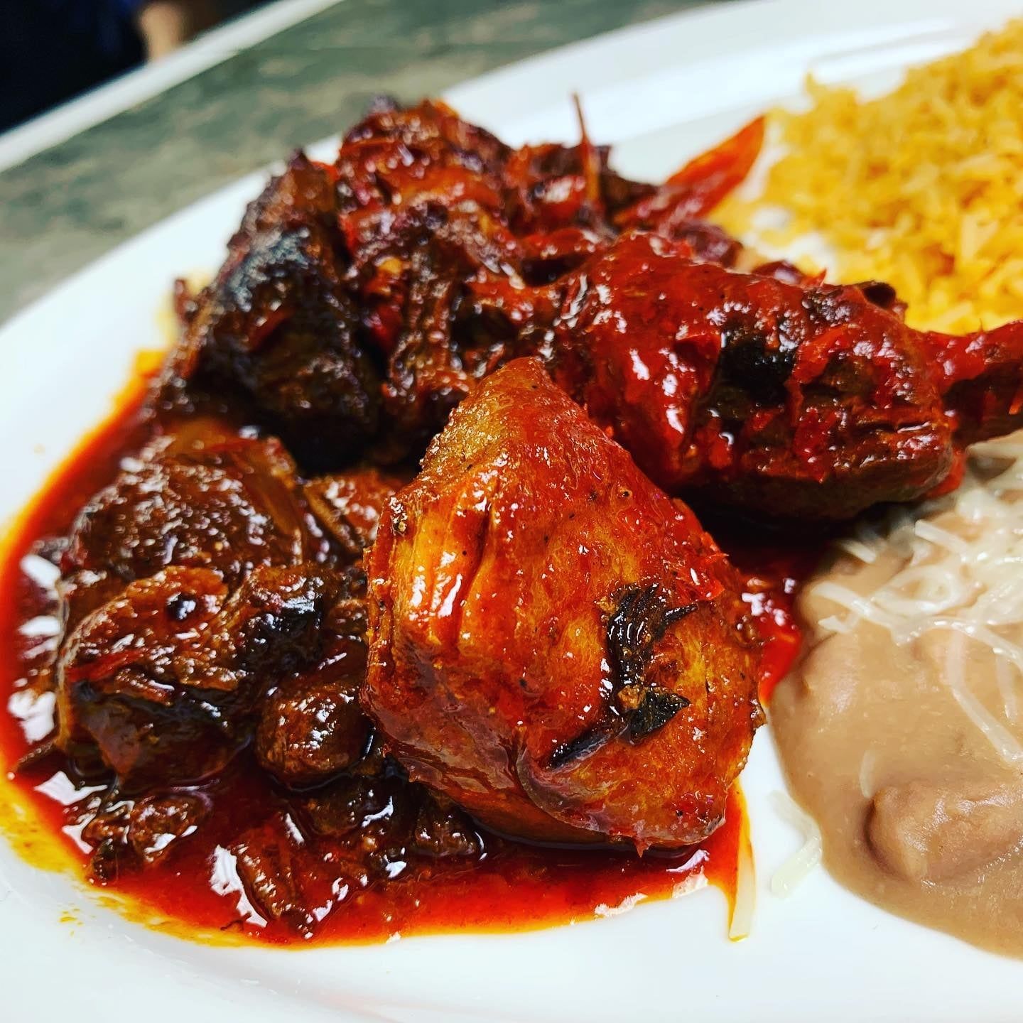 Rich red stew made from tender chuck roast, served with two sides, warm tortillas, and topped with fresh onion, cilantro, and lime.