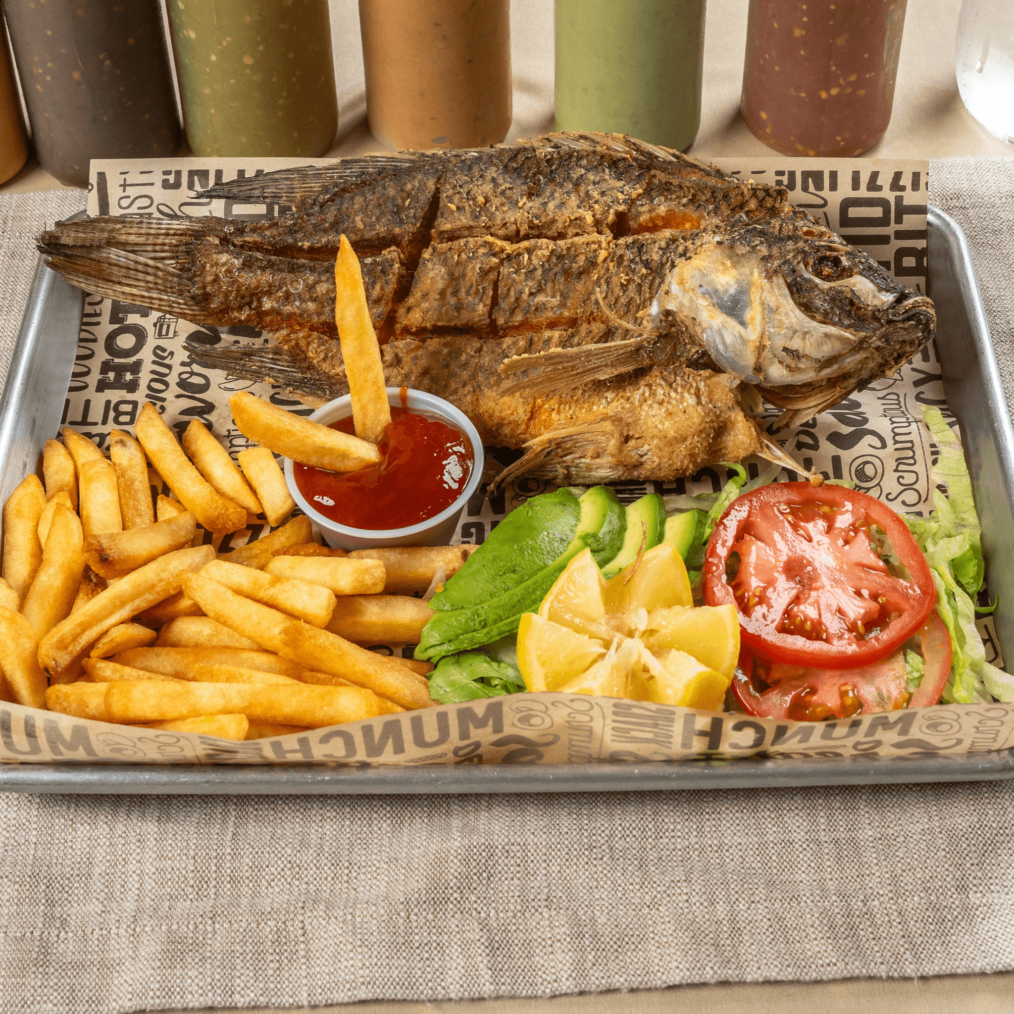 Whole tilapia, seasoned and deep-fried until crispy on the outside and tender inside. Served with rice and salad.