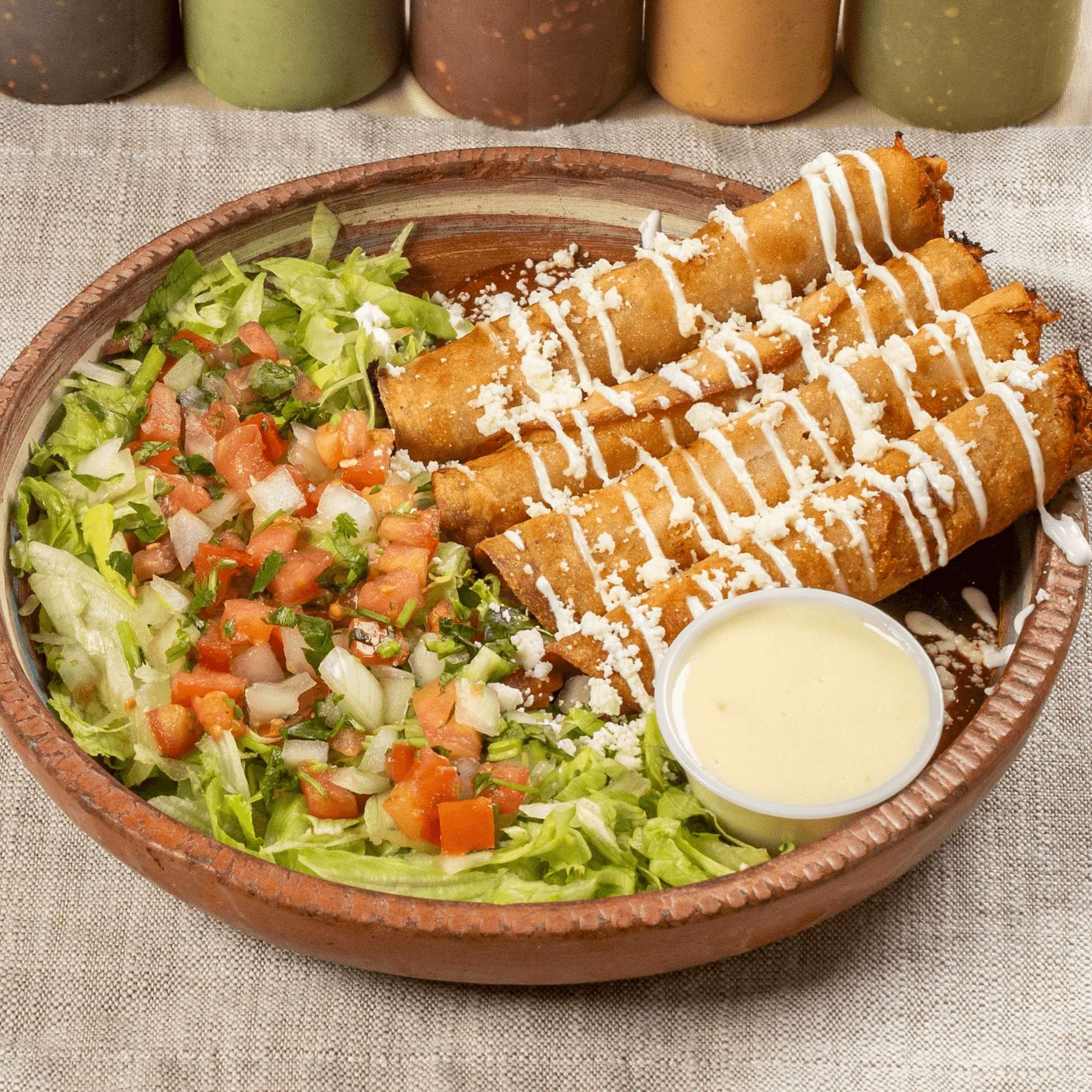 Fried taquitos. Comes with lettuce, pico de gallo, queso dip and homemade salsa.