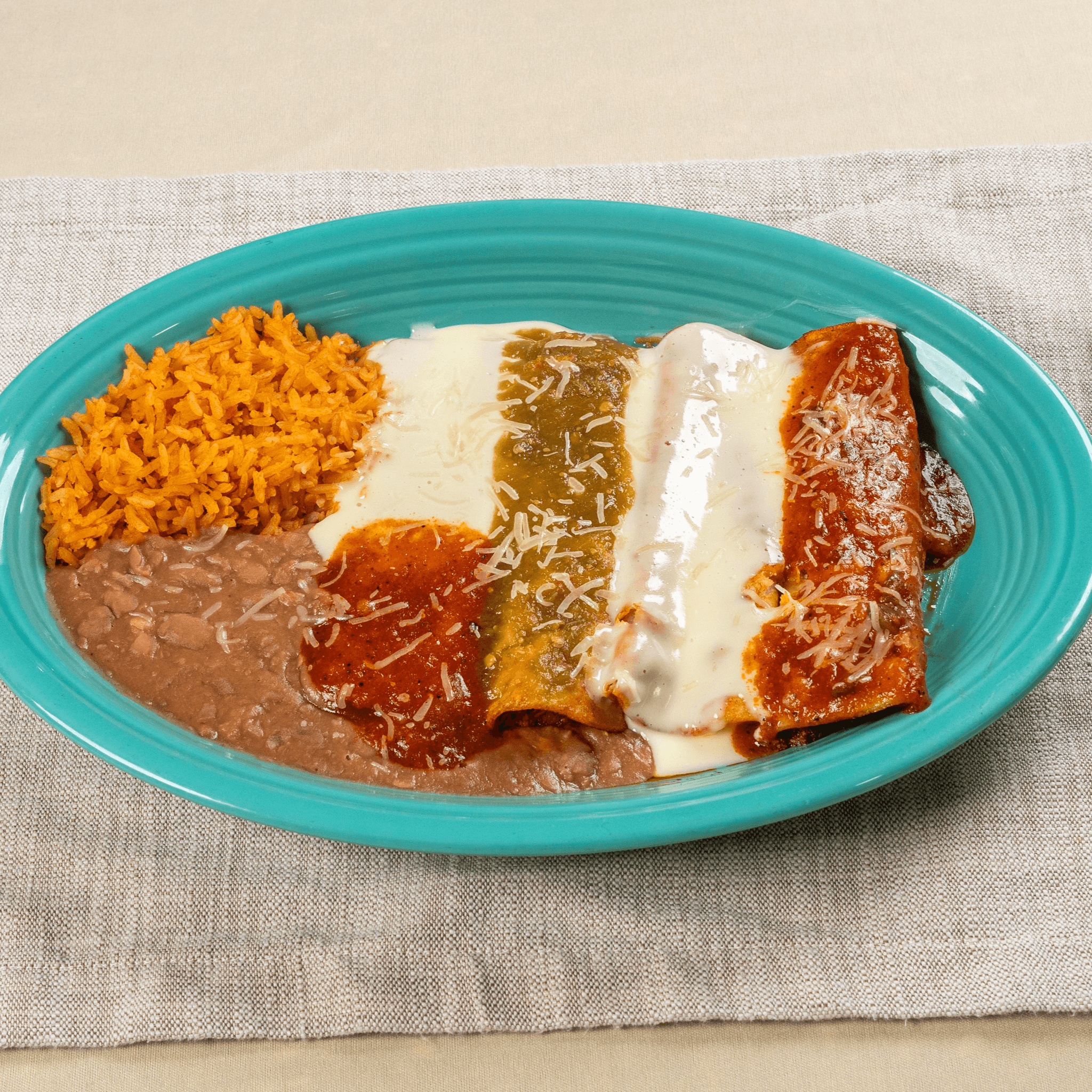 Get 4 Enchiladas: chicken with green salsa, ground beef with red salsa, cheese enchilada with cheese topping, and bean and cheese with red salsa and cheese topping. Comes with 2 sides.