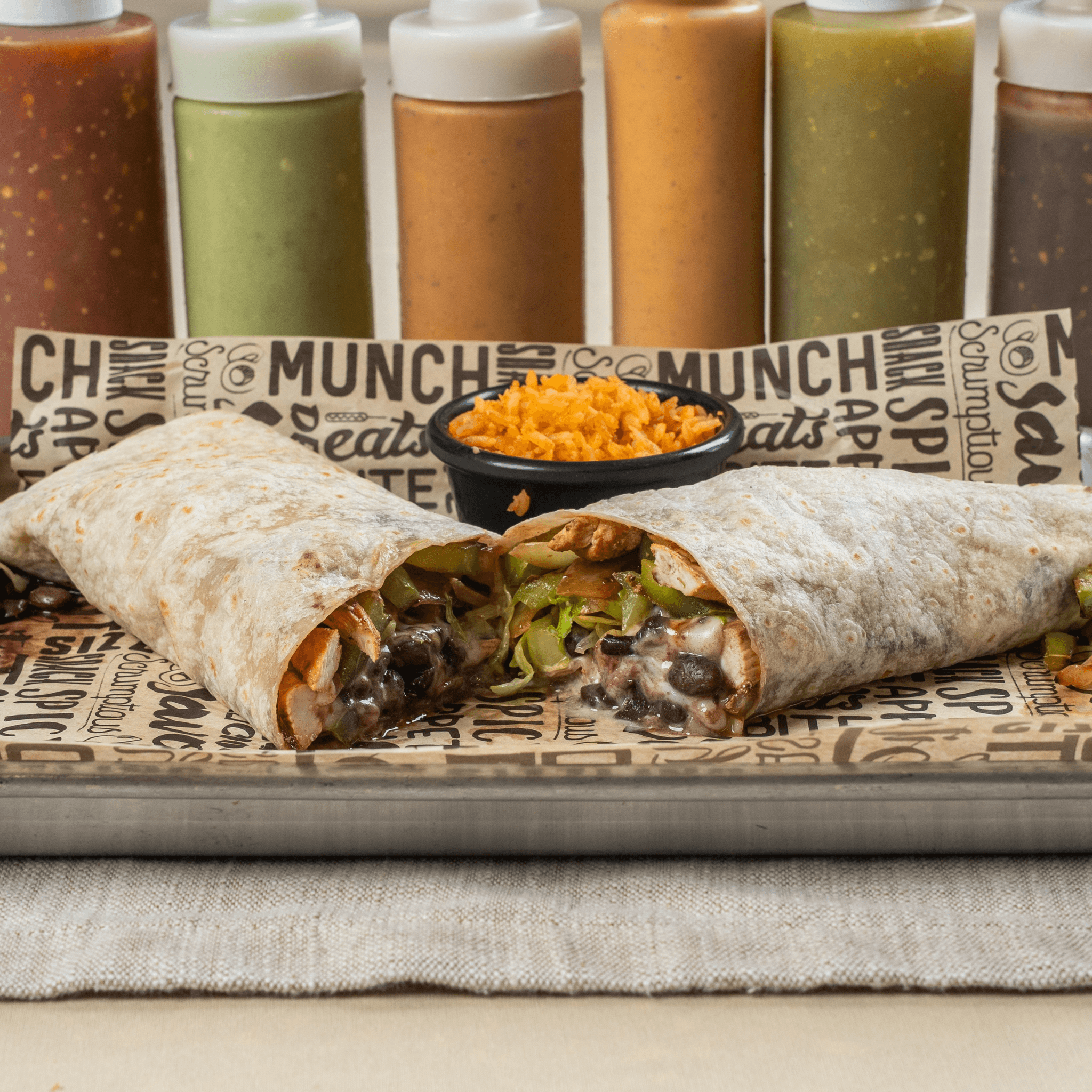 Burrito stuffed choice of protein with fajita veggies (onion, bell pepper and tomato), cheese, sour cream and avocado.