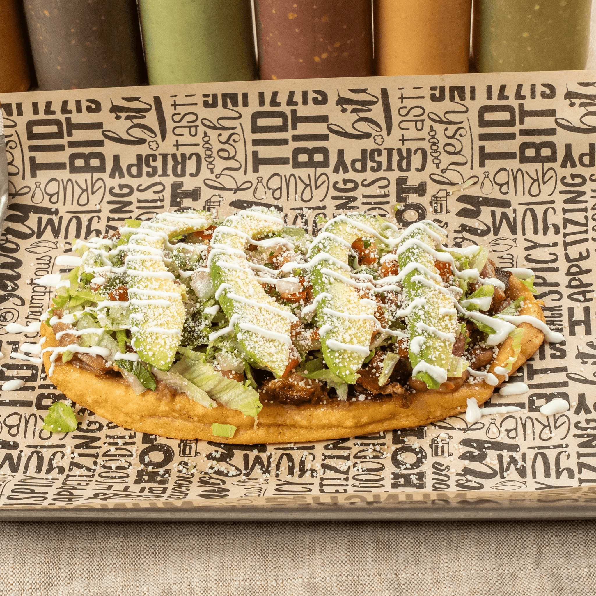 A traditional Mexican dish featuring a thick, hand-shaped masa base topped with beans, protein choice, lettuce, pico, avocado, cotija and sour cream.