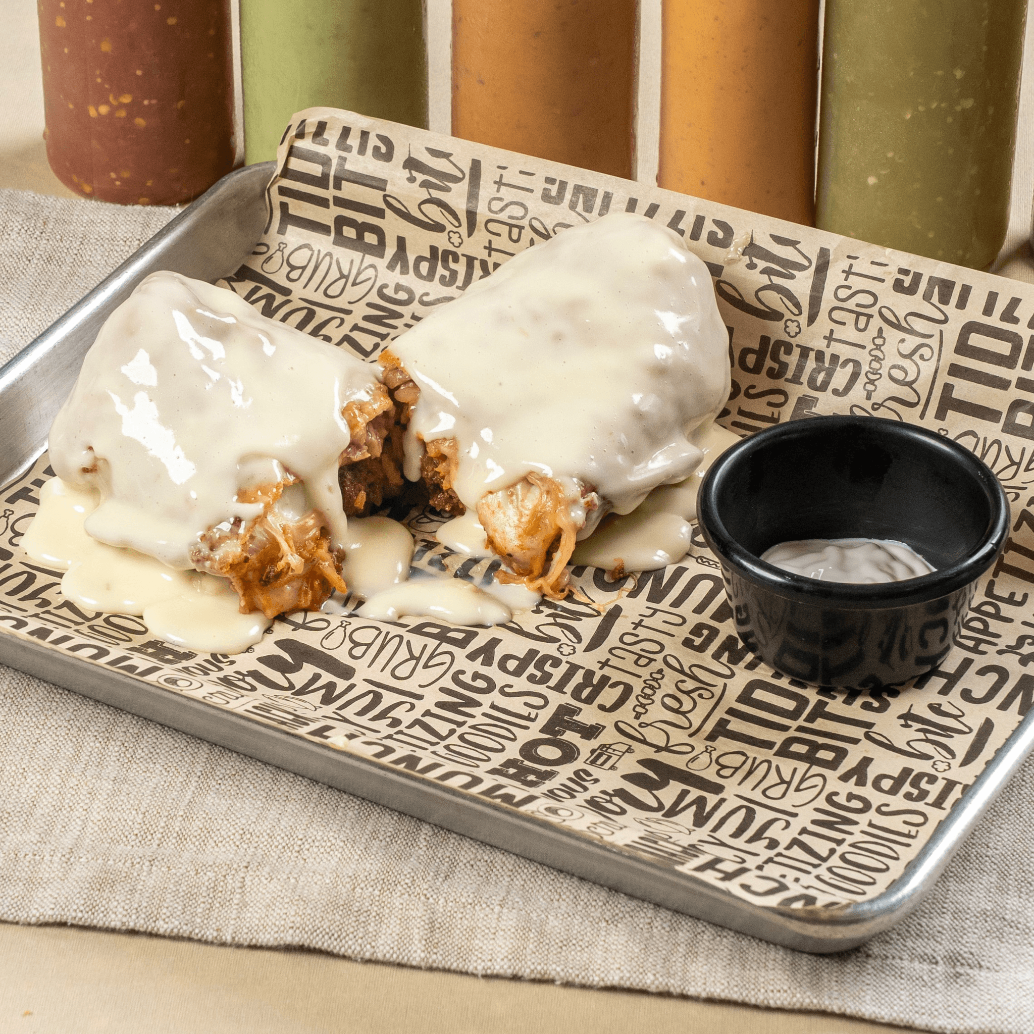Dip fried burrito with choose of protein, rice and beans inside. You can add veggies to it.