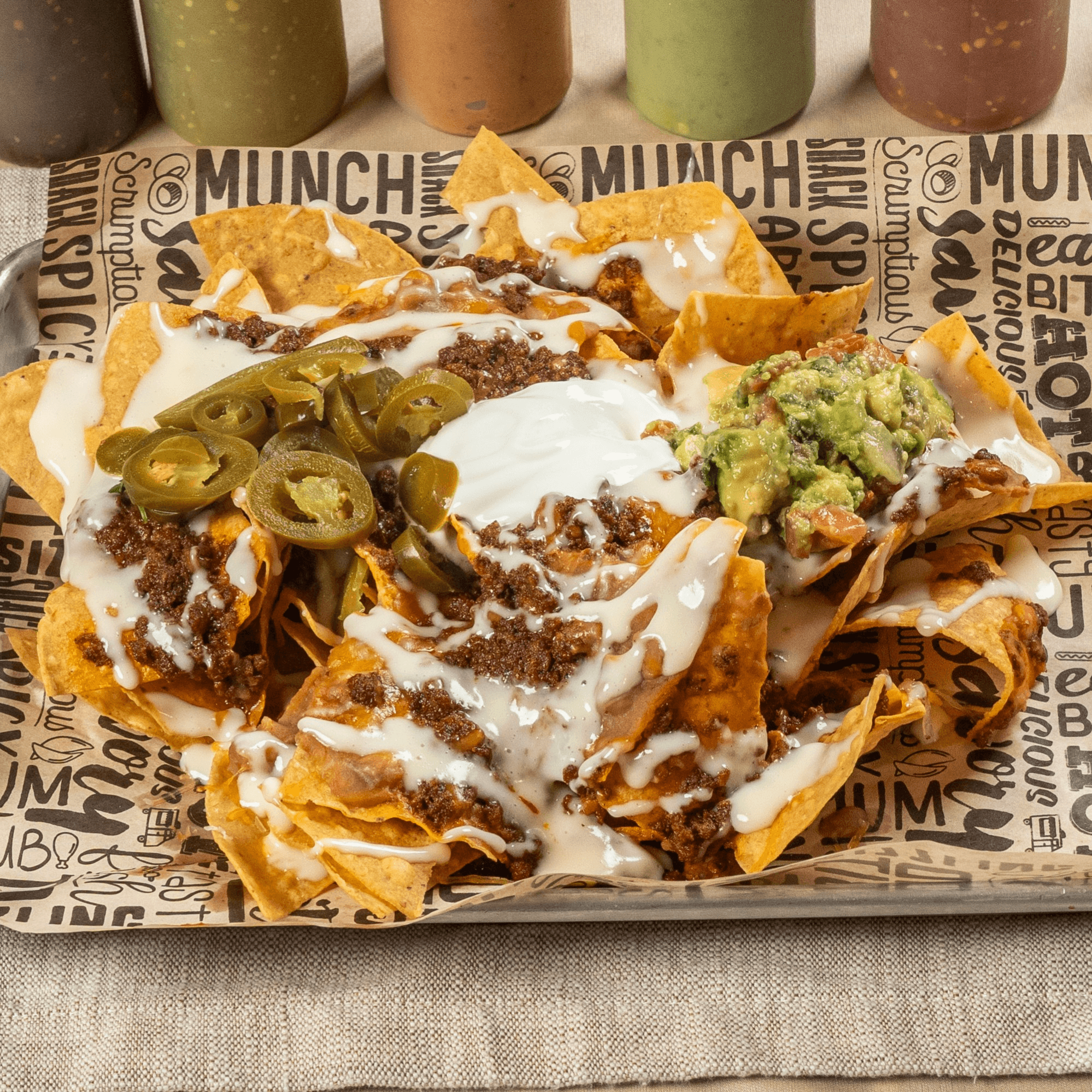 Loaded with ground beef, beans, cheese, guacamole, sour cream and jalapenos.