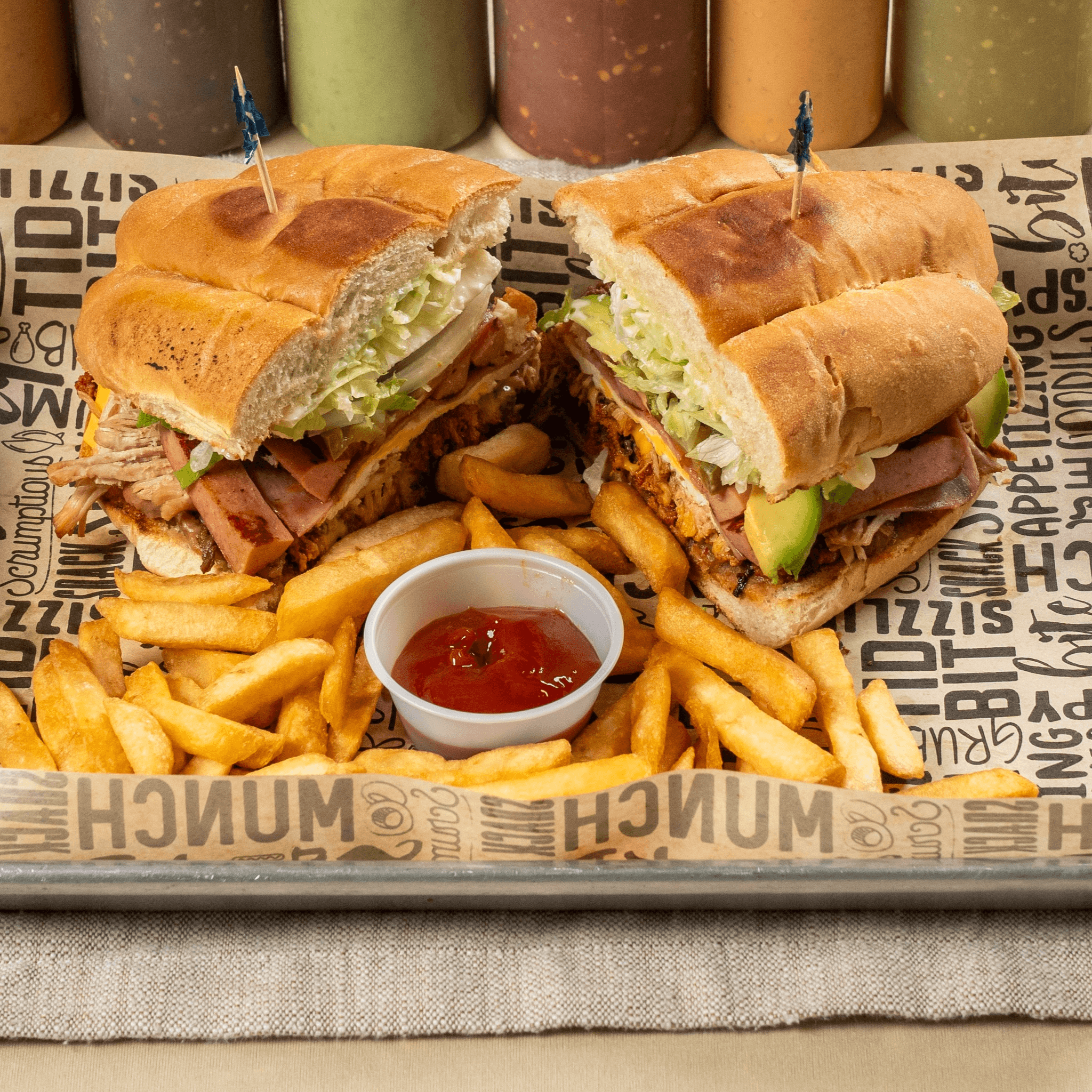Delicious Torta with your choice of meat, stuffed with lettuce, tomato, avocado, pickle jalapeño, onion, queso fresco. Served with a side of fries.