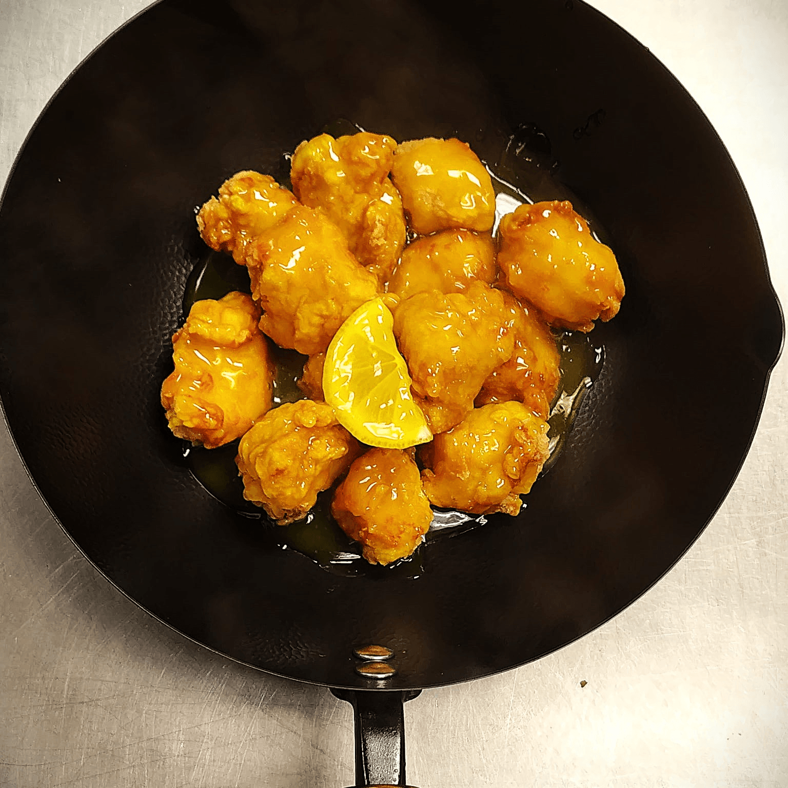 Springfield-style breaded all white meat chicken with lemon sauce on the side. Comes with fried rice, 1 crab rangoon, and 1 egg roll. Can be substituted for steamed rice, crab rangoons, or 2 egg rolls instead at no additional charge.