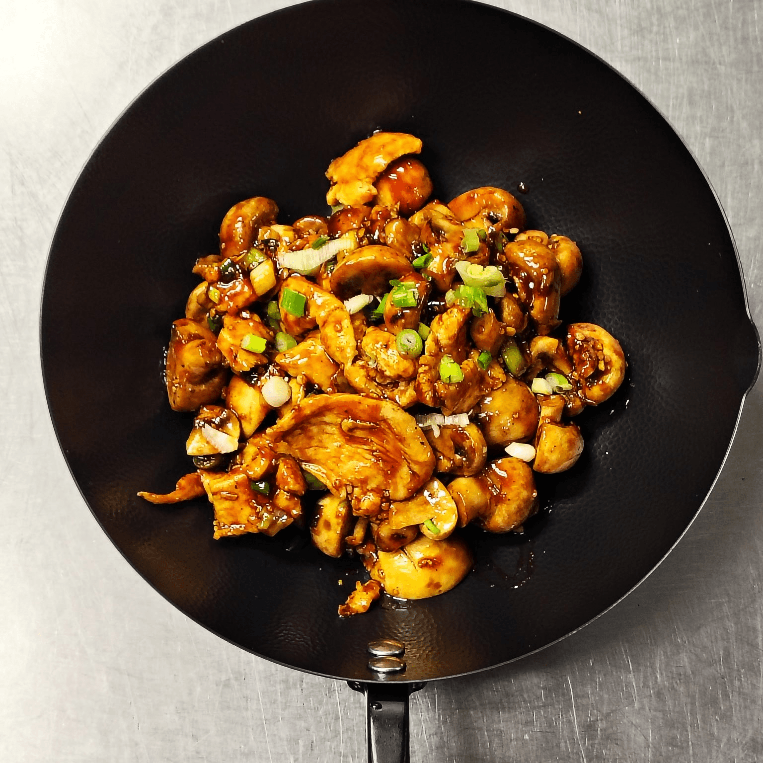 26 oz. traditional Chinese bucket. Includes your choice of steamed or fried rice. All white meat chicken cooked with garlic, chopped green onions, and mushrooms in a house brown sauce