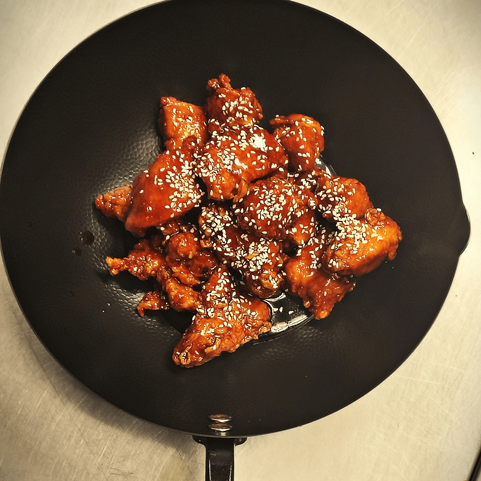 26 oz. traditional Chinese bucket. Includes your choice of steamed or fried rice. Springfield-style breaded all white meat chicken cooked in a brown sauce with sesame seeds