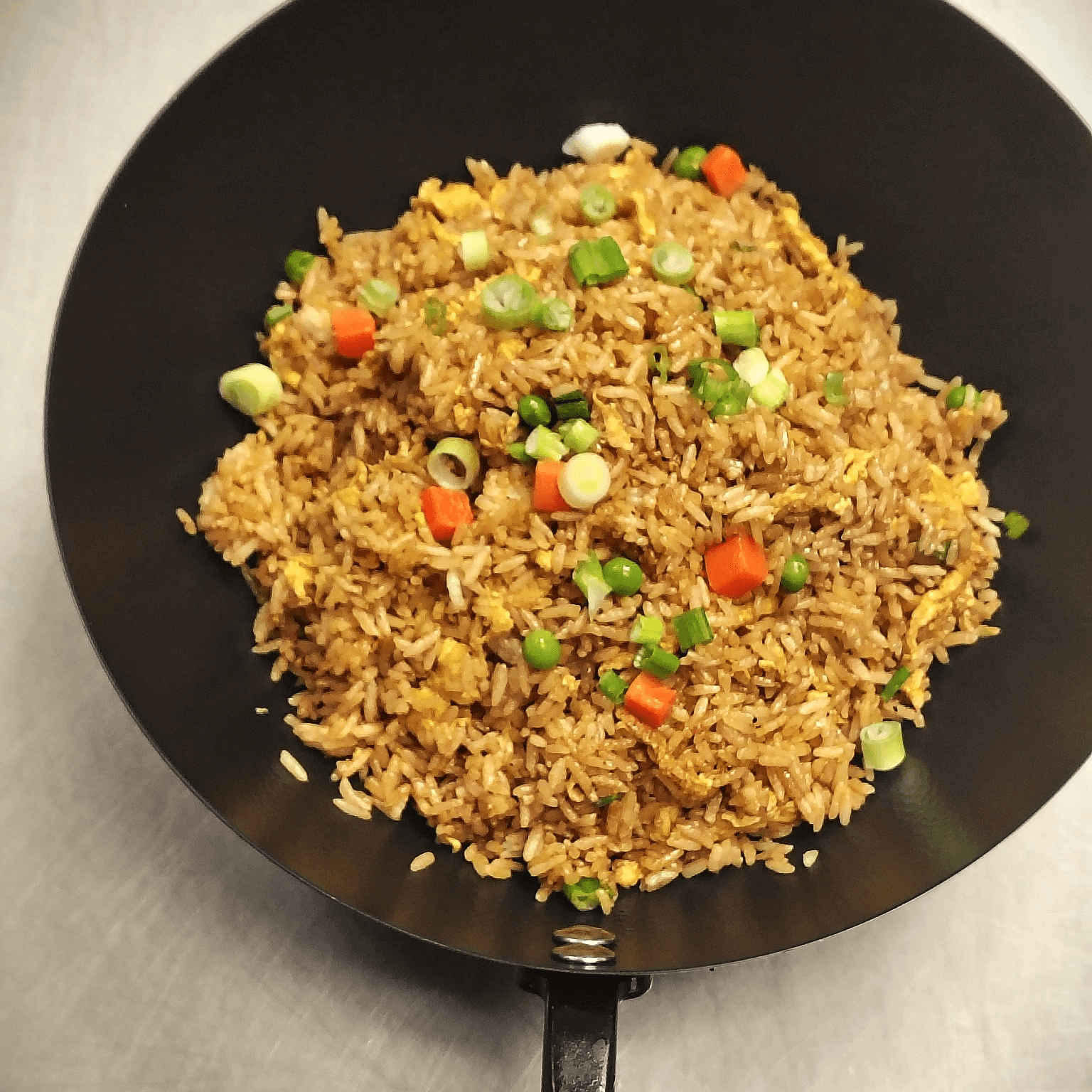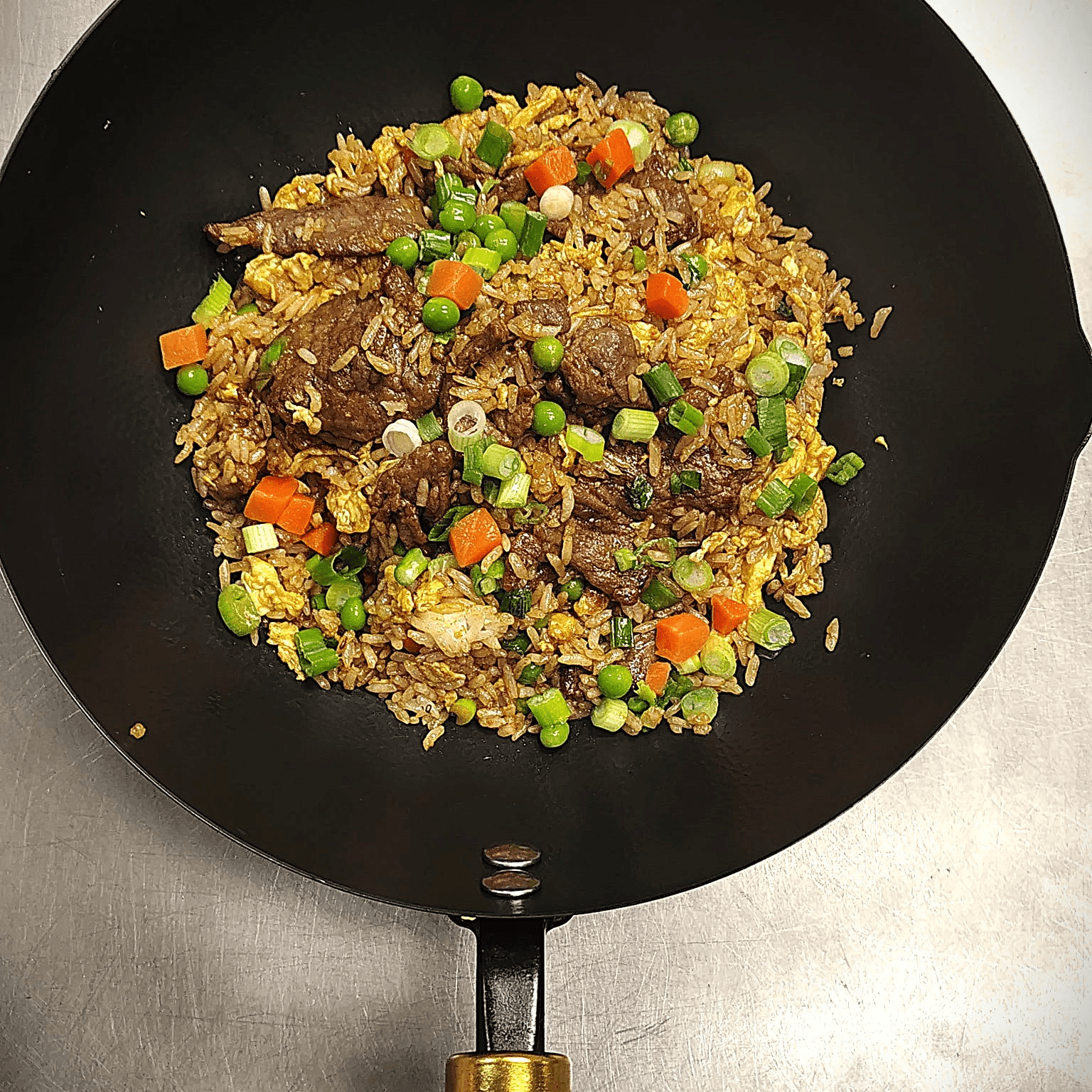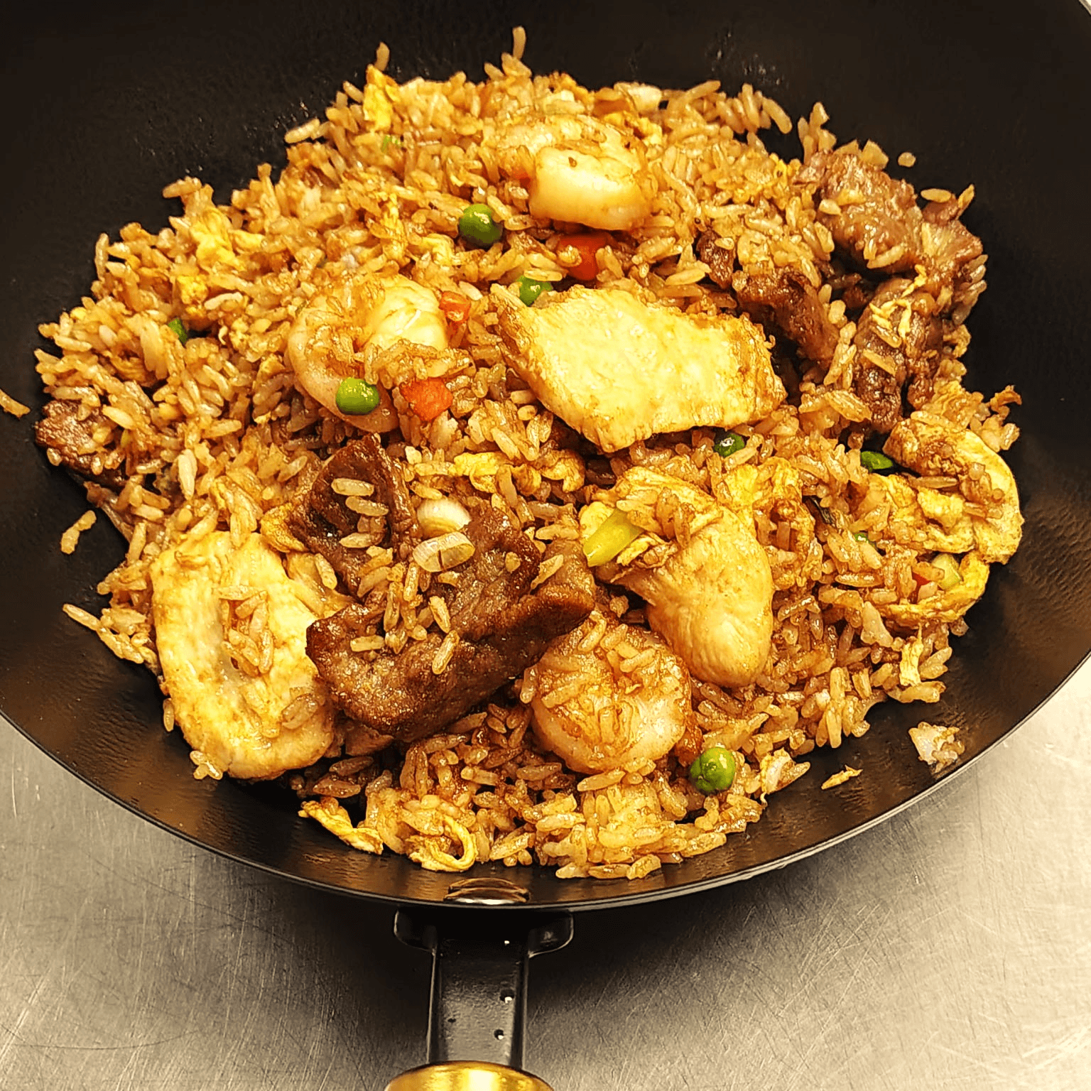 Chicken, beef, and shrimp stir fried with green onions, peas, and carrots with soy sauce, egg, and rice