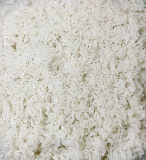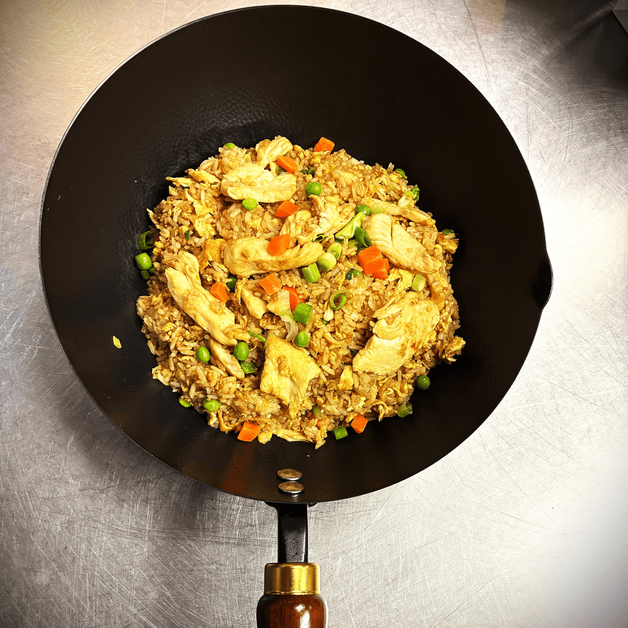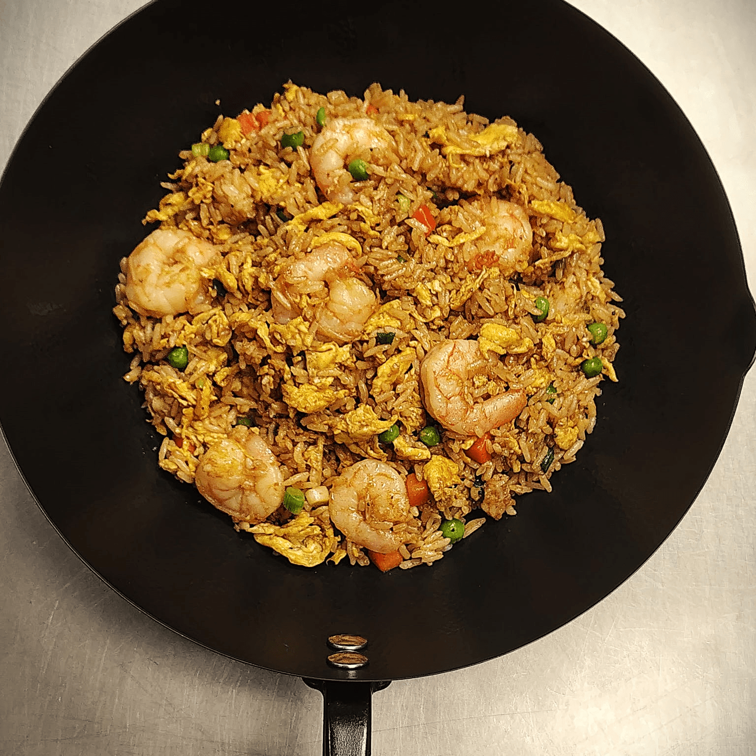 Chicken, beef, and shrimp stir fried with green onions, peas, and carrots with soy sauce, egg, and rice