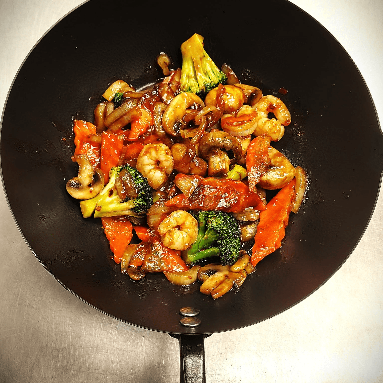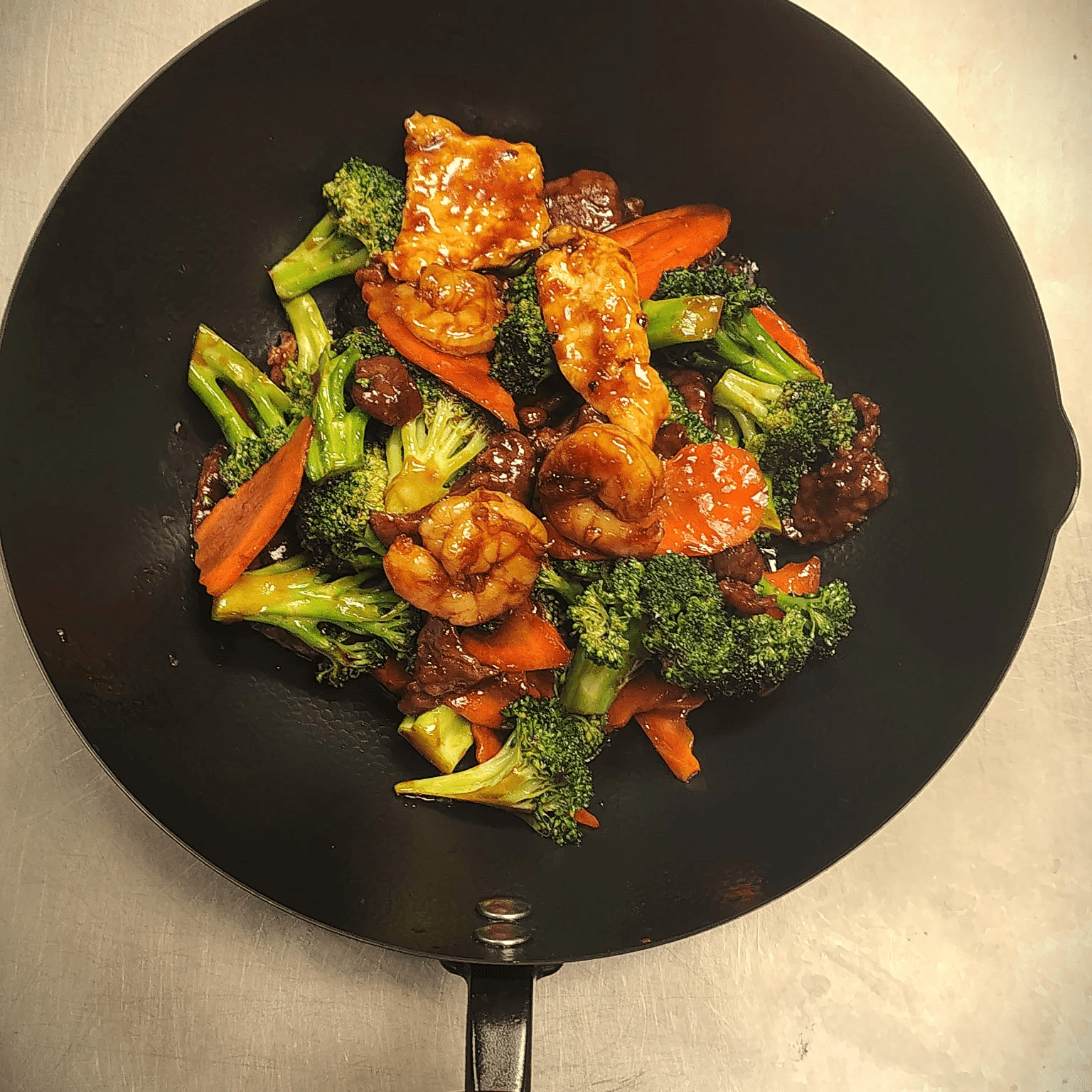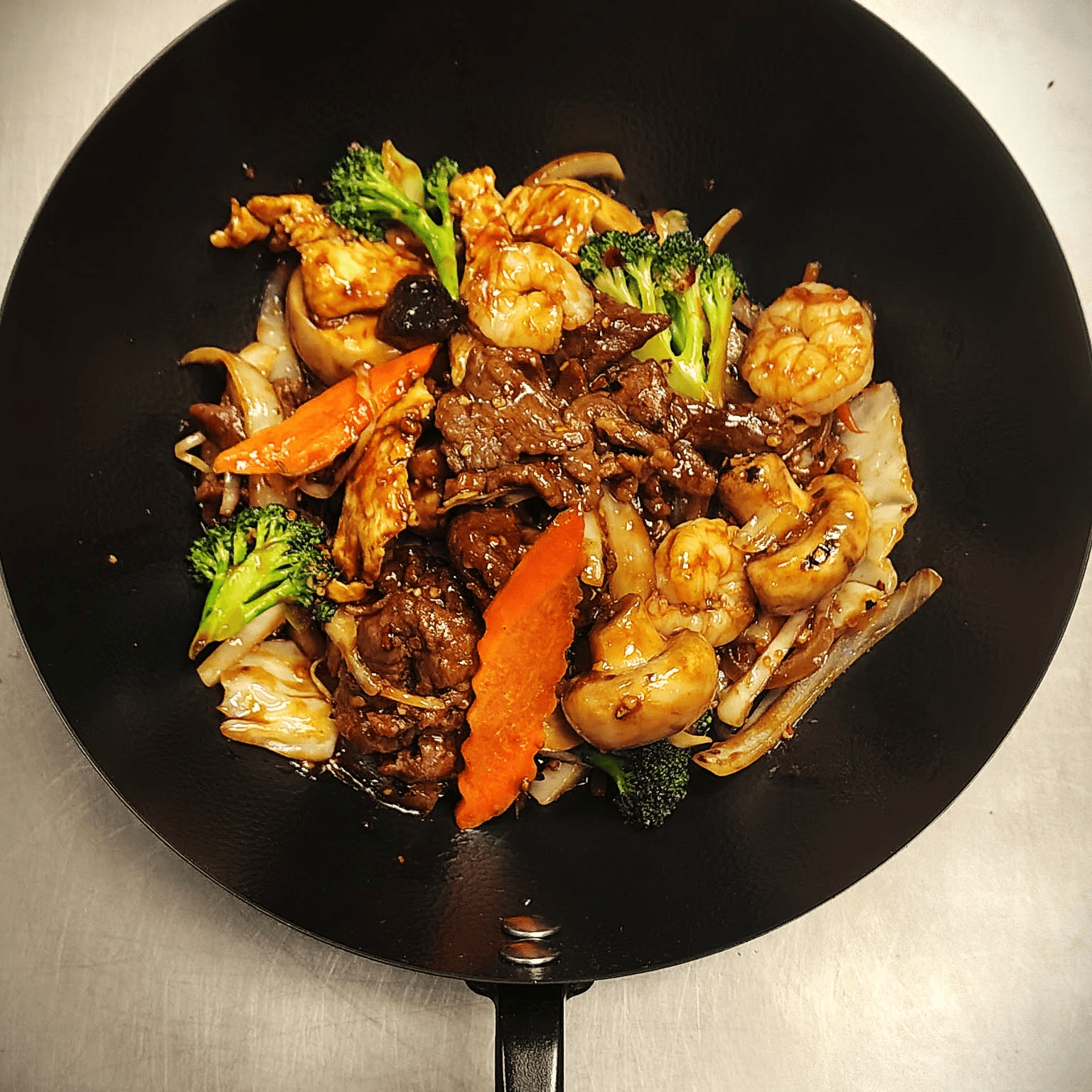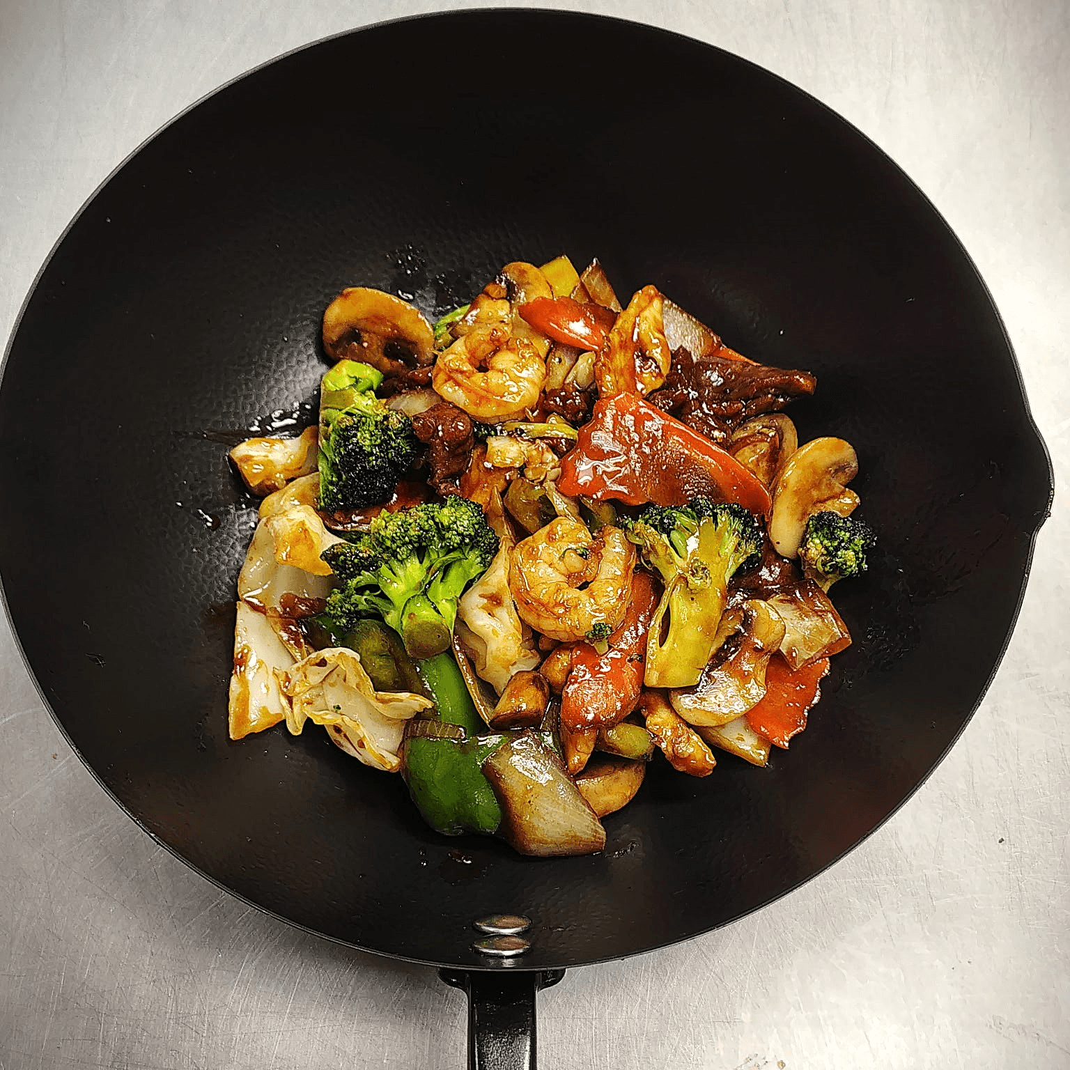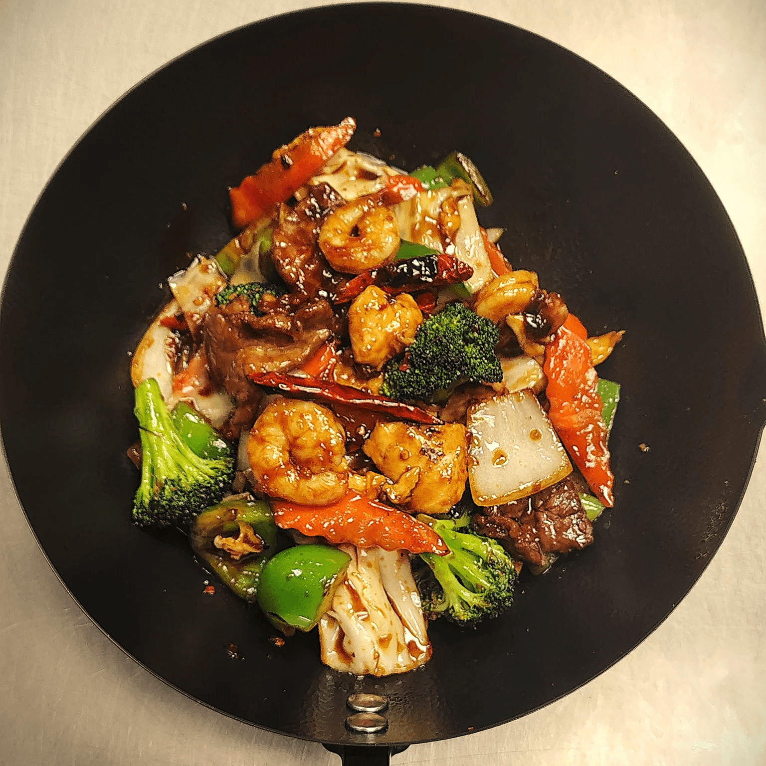 Chicken, beef, and shrimp stir fried with broccoli, mushrooms, carrots, and onions in a spicy brown sauce