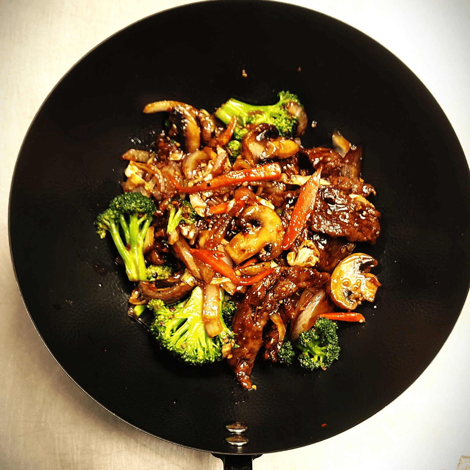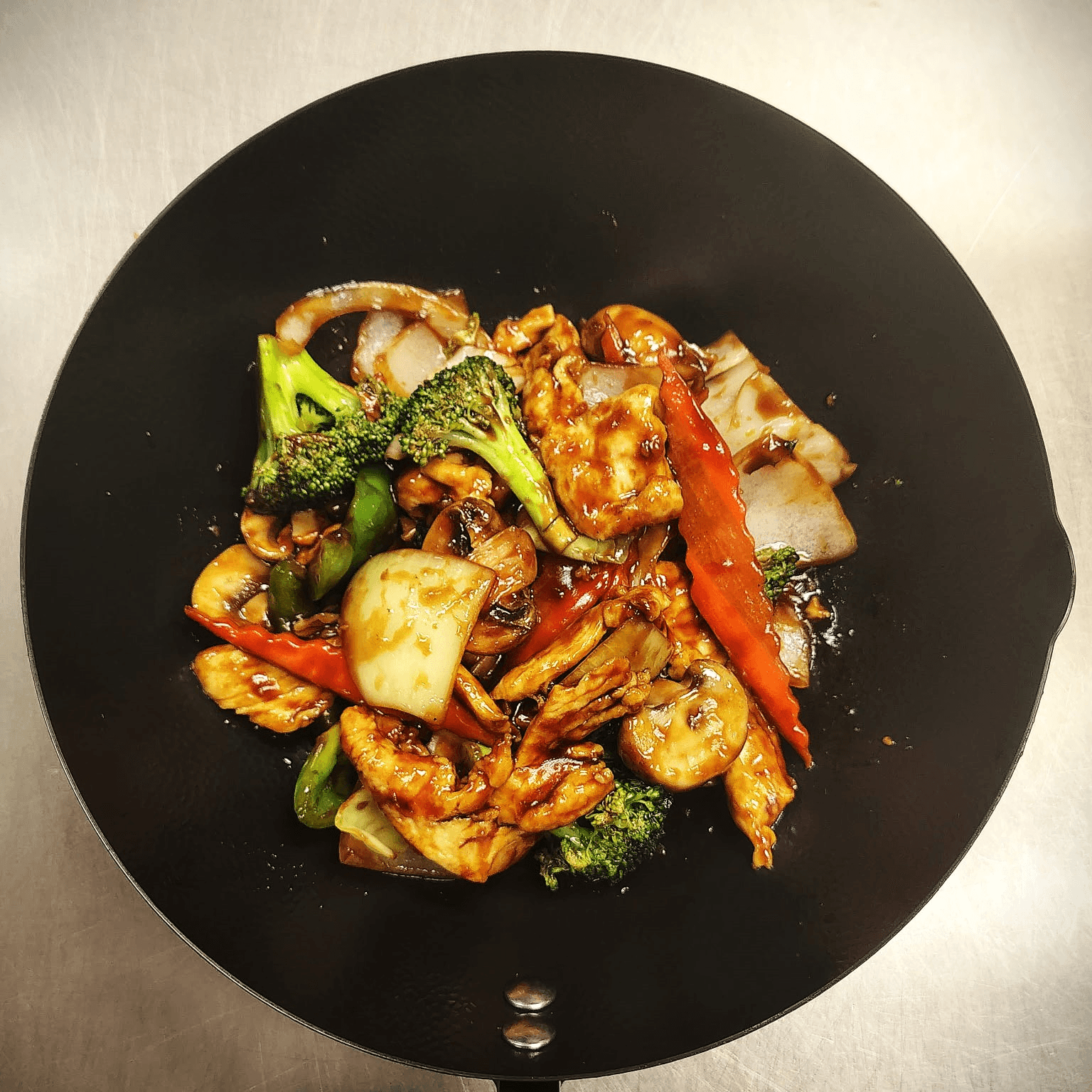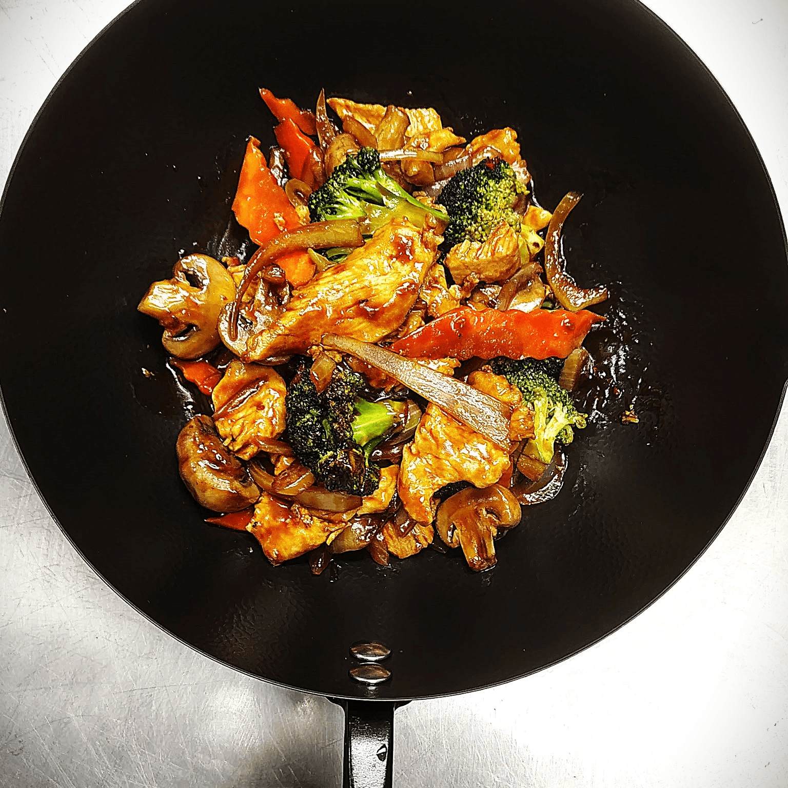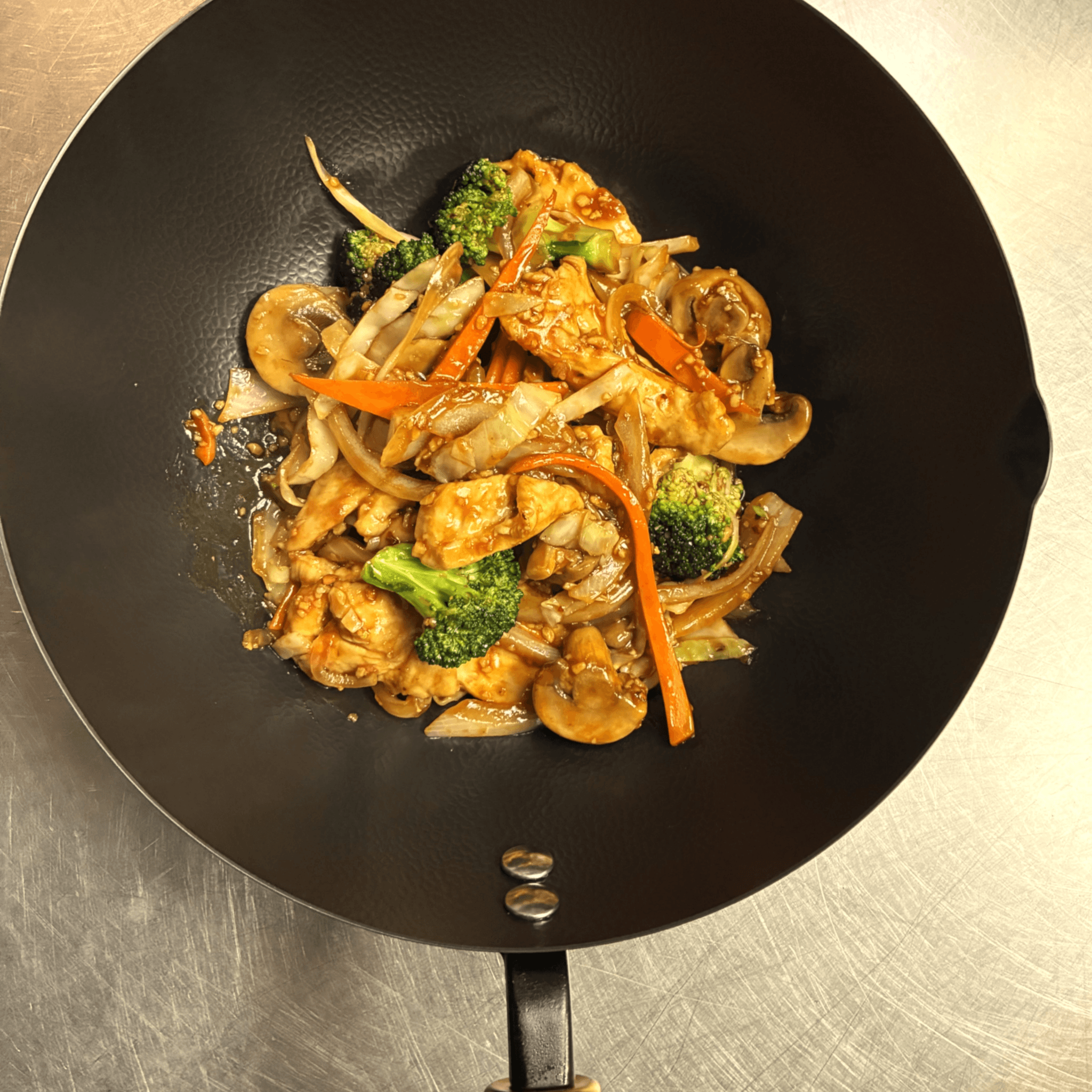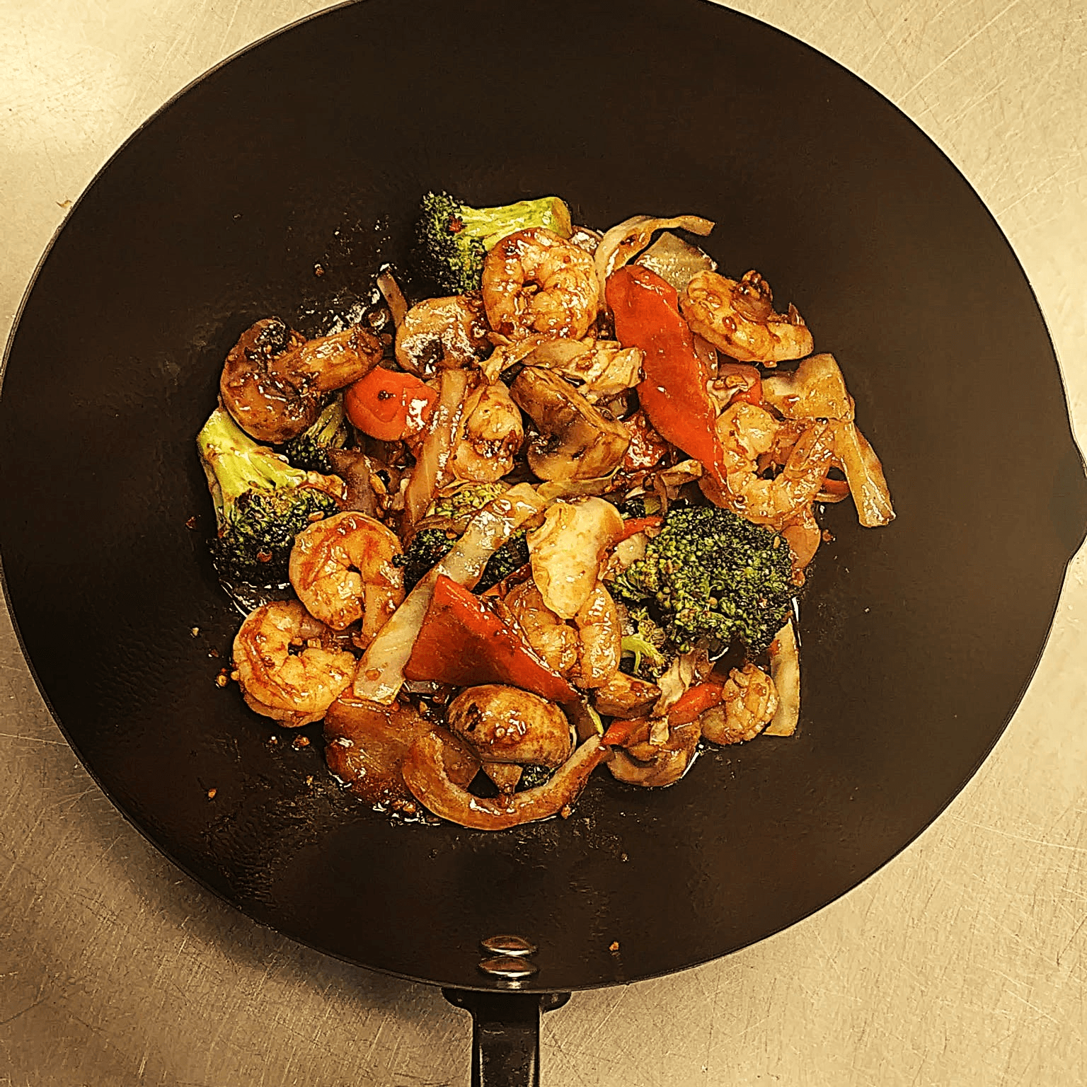 Chicken, beef, and shrimp stir fried with broccoli, mushrooms, carrots, and onions in a spicy brown sauce