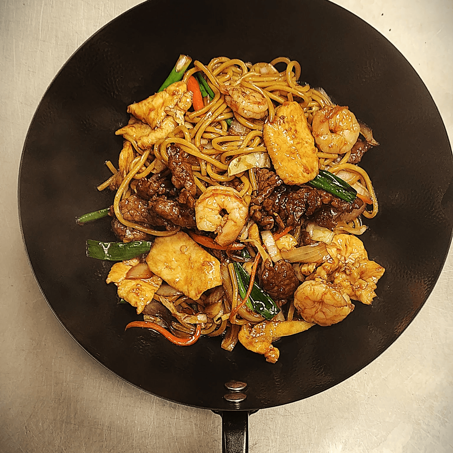 Chicken, beef, and shrimp stir fried with carrots, cabbage, white onion, and green onion in a brown sauce with noodles