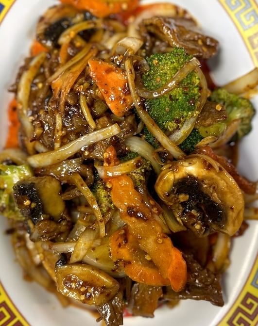 6 oz. traditional Chinese bucket. Includes your choice of steamed or fried rice. Click a menu image for a preview of the dish. Spicy! Beef with white onions, mushrooms, carrots, and broccoli in a spicy brown sauce