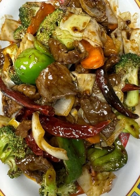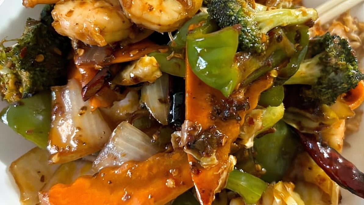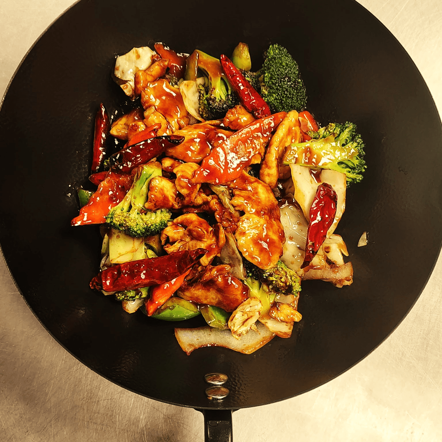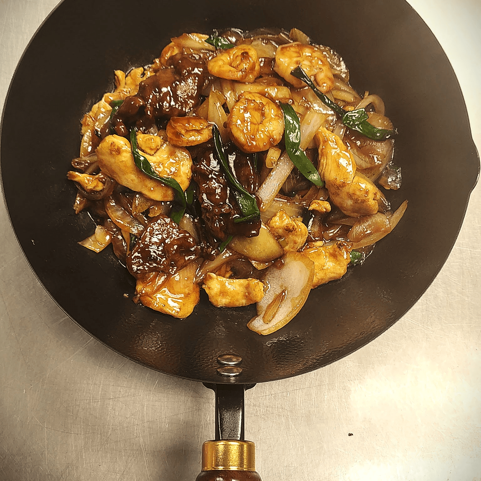 Chicken, beef, and shrimp stir fried with cabbage, bell peppers, onions, broccoli, carrots, and dried red chili peppers in a spicy brown sauce
