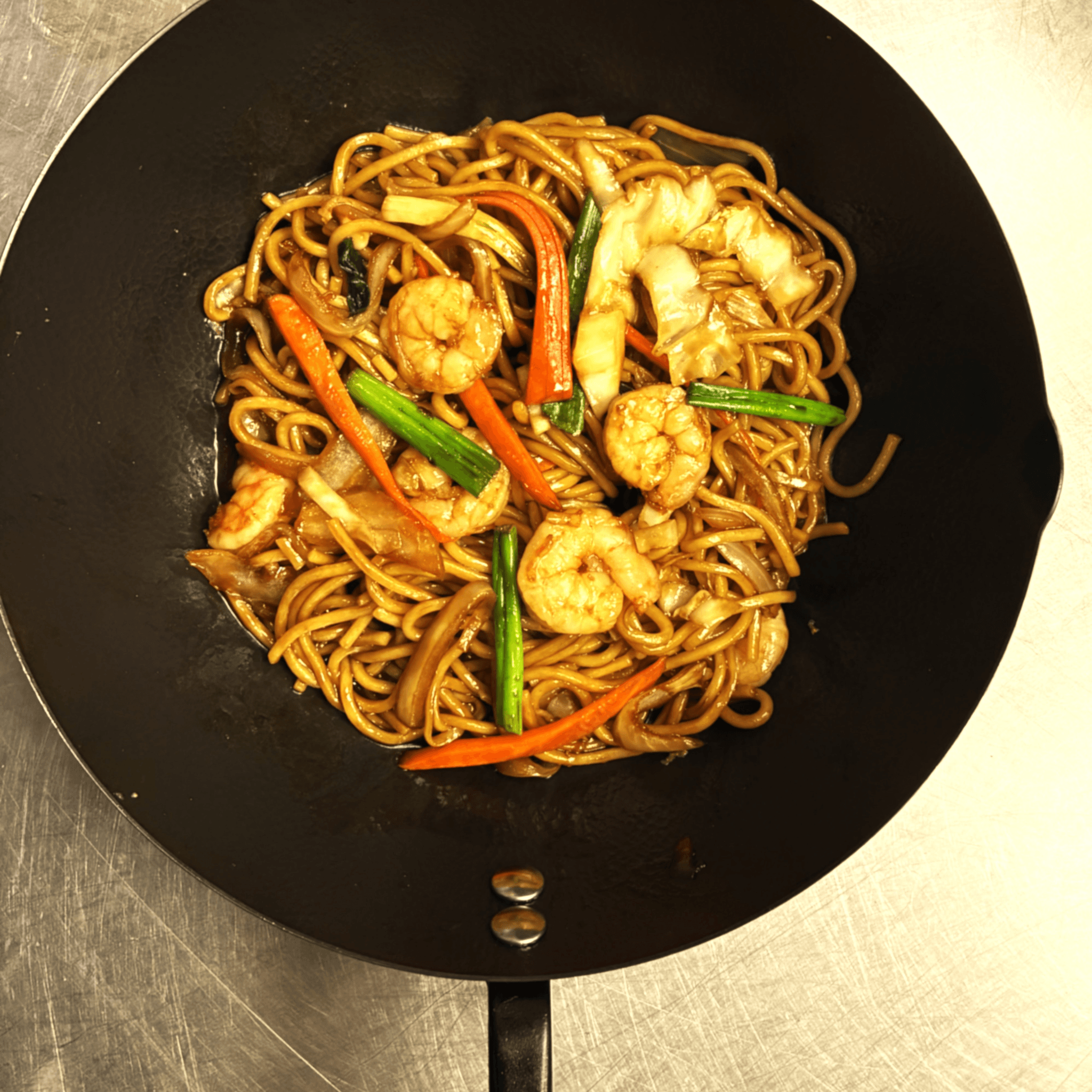 Shrimp with lo mein noodles, cabbage, carrots, onions, and green onions. Comes with fried rice, 1 crab rangoon, and 1 egg roll. Can be substituted for steamed rice, crab rangoons, or 2 egg rolls instead at no additional charge.