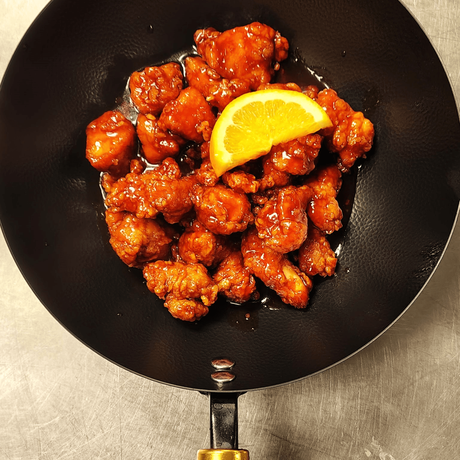 26 oz. traditional Chinese bucket. Includes your choice of steamed or fried rice. Springfield-style breaded all white meat chicken cooked in an orange sauce