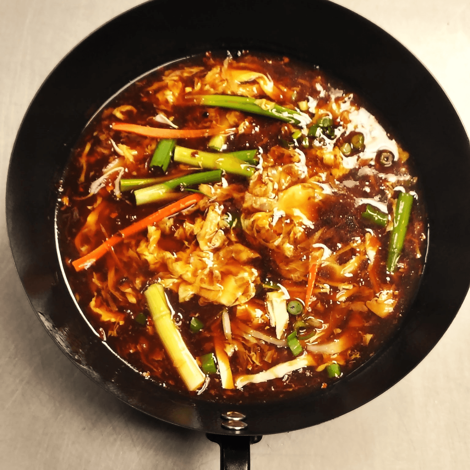 Soup that is both spicy and sour typically flavored with hot pepper and vinegar