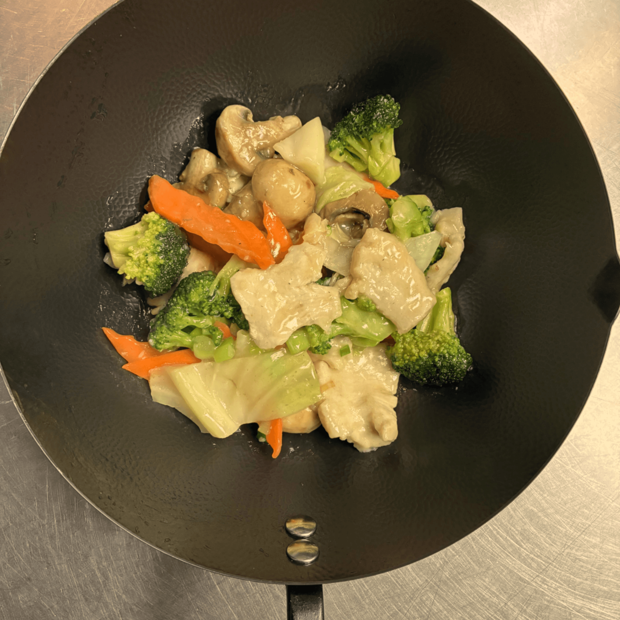 26 oz. traditional Chinese bucket. Includes your choice of steamed or fried rice. All white meat chicken, cabbage, mushrooms, broccoli, and carrots in a hand-made white sauce
