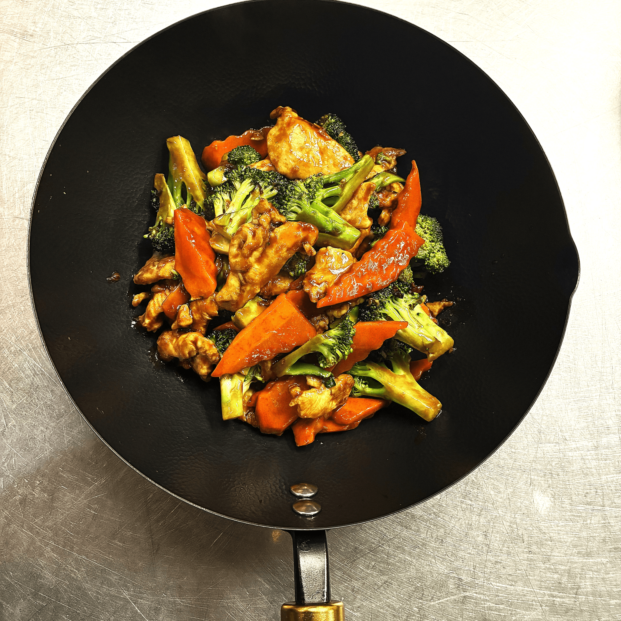 26 oz. traditional Chinese bucket. Includes your choice of steamed or fried rice. All white meat chicken with broccoli, carrots, and a hand-made brown sauce