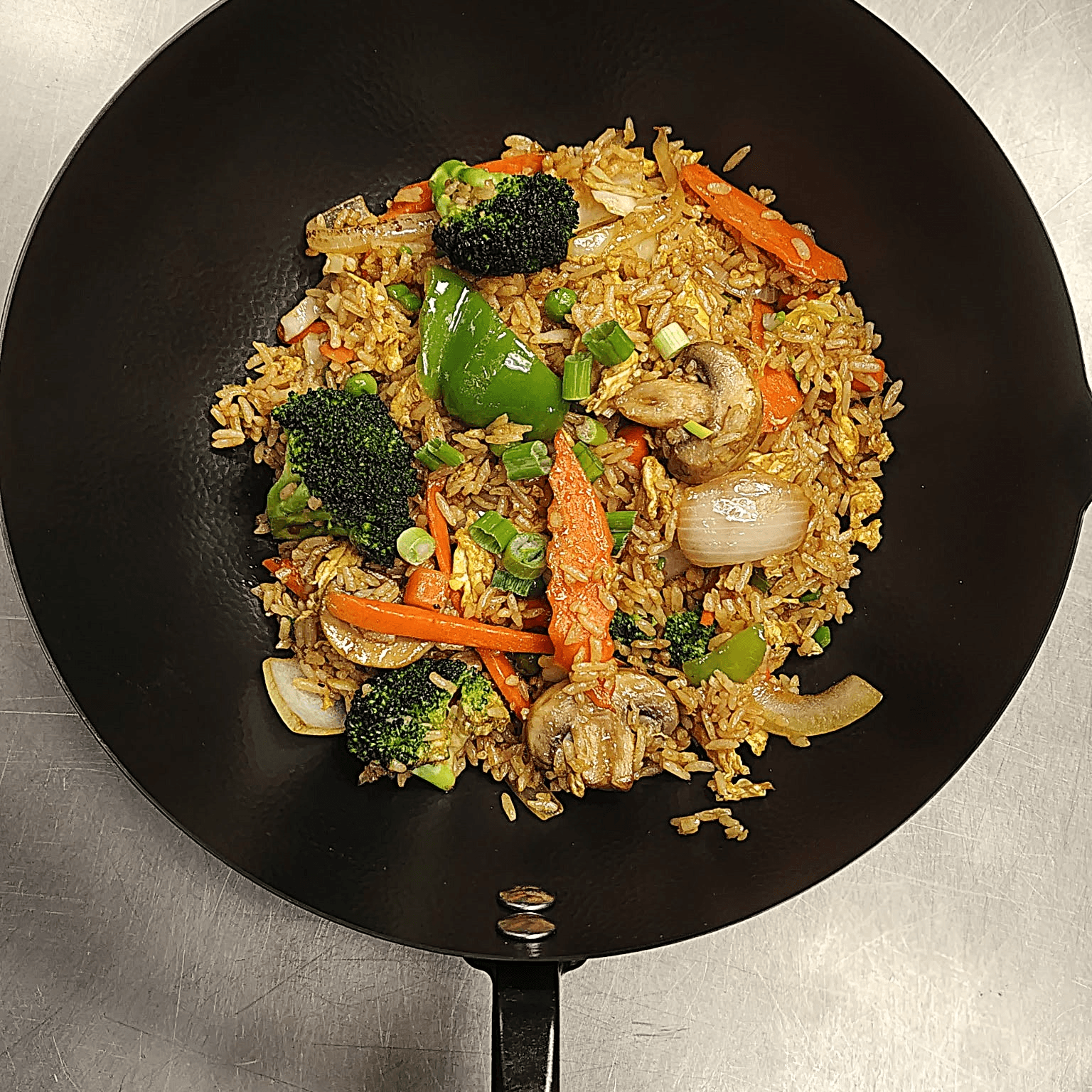 Peas, carrots, green onions, white onions, bell peppers, broccoli, and mushrooms with egg and soy sauce. Comes with fried rice, 1 crab rangoon, and 1 egg roll. Can be substituted for crab rangoons, or 2 egg rolls instead at no additional charge.