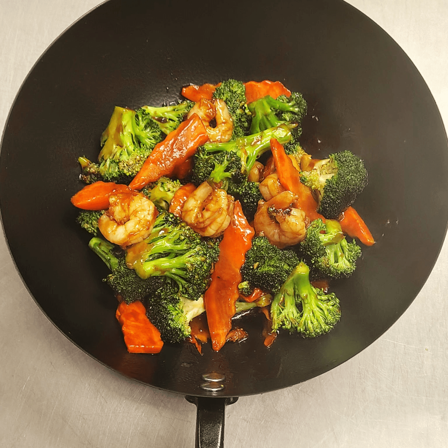 26 oz. traditional Chinese bucket. Includes your choice of steamed or fried rice. Shrimp with broccoli carrots, and a hand-made brown sauce